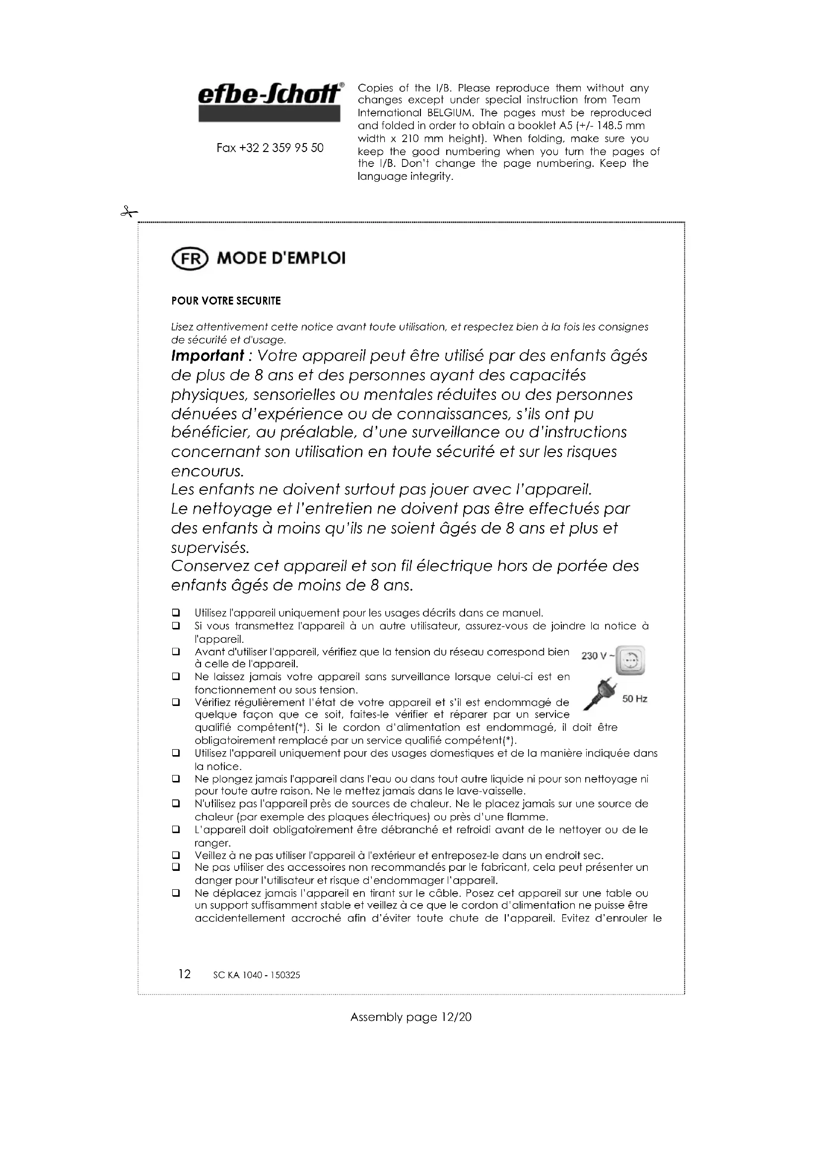Afin de préserver notre environnement et notre santé, l’élimination en fin de vie des appareils électriques et électroniques doit se faire selon des règles bien précises et nécessite l’implication de chacun, qu’il soit fournisseur ou utilisateur. C’est pour cette raison que votre appareil, tel que le signale le symbole apposé sur sa plaque signalétique ou sur l'emballage, ne doit en aucun cas être jeté dans une poubelle publique ou privée destinée Copies of the I/B. Please reproduce them without any changes except under special instruction from Team International BELGIUM. The pages must be reproduced and folded in order to obtain a booklet A5 (+/- 148.5 mm width x 210 mm height). When folding, make sure you keep the good numbering when you turn the pages of the I/B. Don’t change the page numbering. Keep the language integrity. 15 SC KA 1040 - 150325