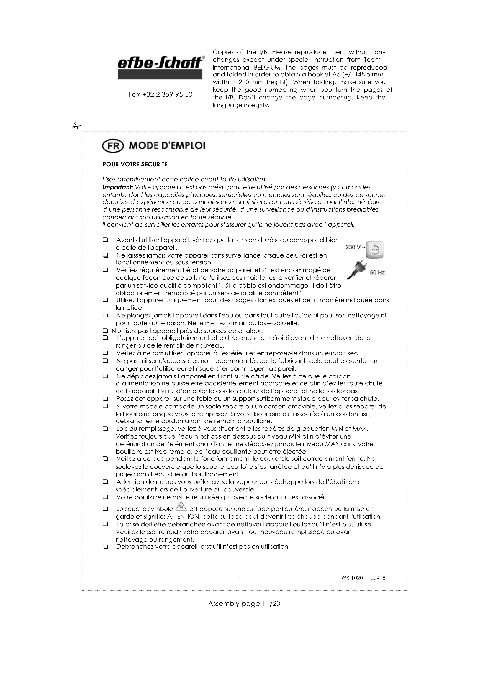 Si vous constatez un défaut, adressez-vous à votre revendeur ou au magasin et retournez l'appareil complet dans son emballage d'origine ainsi que le ticket de caisse. Les réclamations introduites dans le cadre de la garantie sont uniquement valables si le ticket de caisse ou la copie d’une facture de réparation éventuelle est joint(e). Copies of the I/B. Please reproduce them without any changes except under special instruction from Team International BELGIUM. The pages must be reproduced and folded in order to obtain a booklet A5 (+/- 148.5 mm width x 210 mm height). When folding, make sure you keep the good numbering when you turn the pages of the I/B. Don’t change the page numbering. Keep the language integrity. 14 WK 1020 - 120418