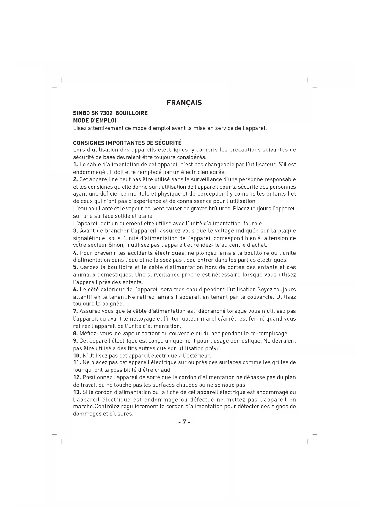 MODE D'EMPLOI SK7302 SINBO