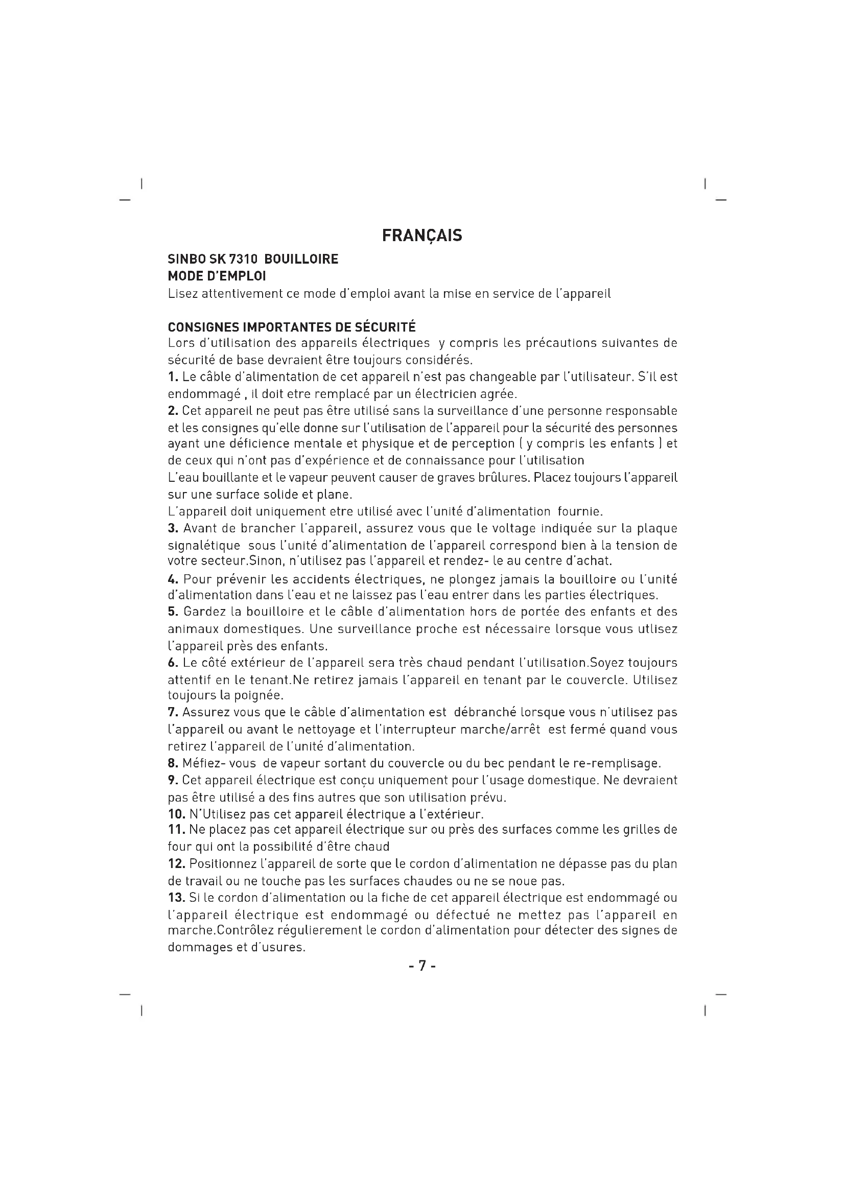 SK7310C - Bouilloire SINBO - Notice d'utilisation et mode d'emploi gratuit