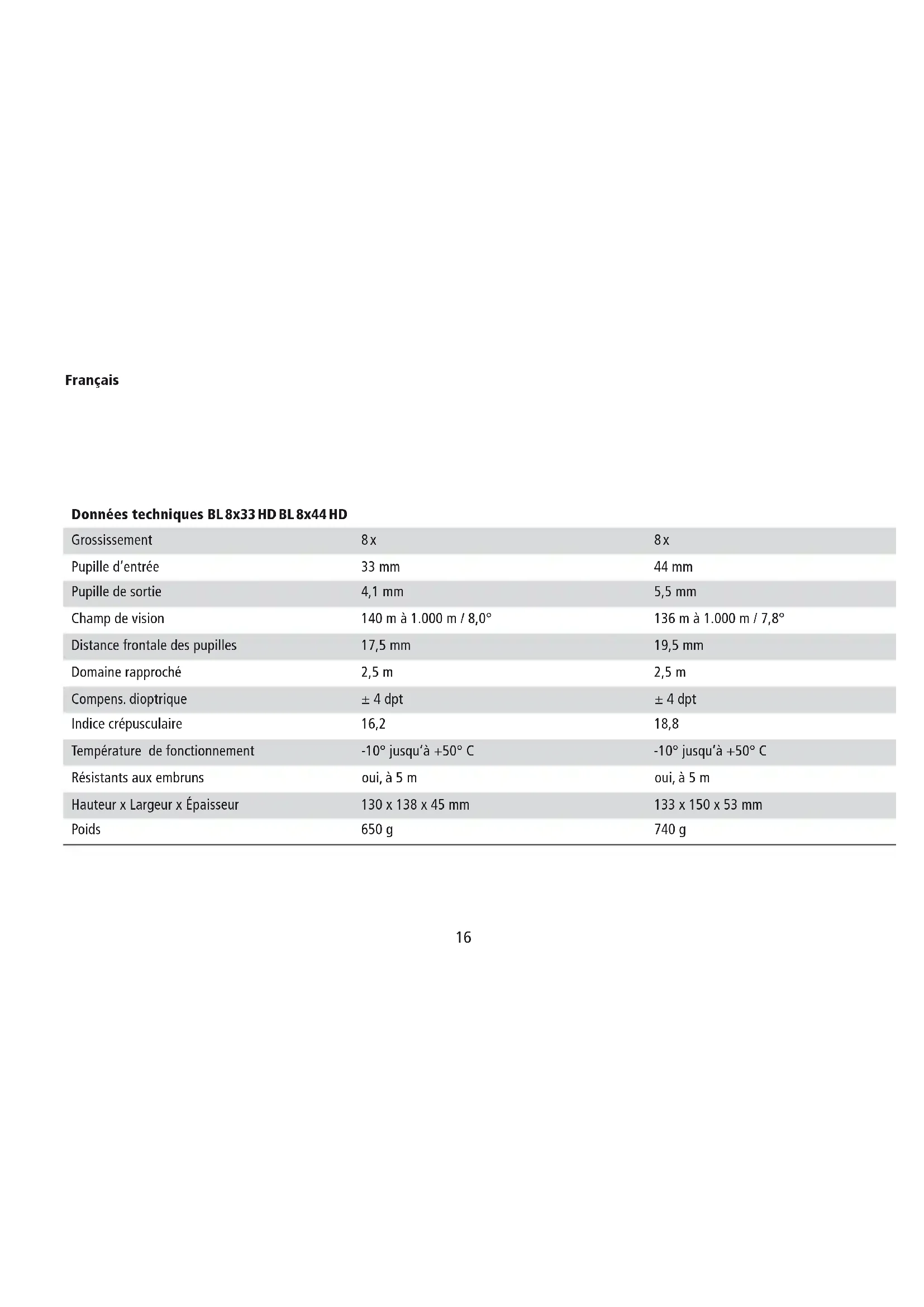 | Champ de vision | 140 m à 1.000 m / 8,0° | 136 m à 1.000 m / 7,8° |