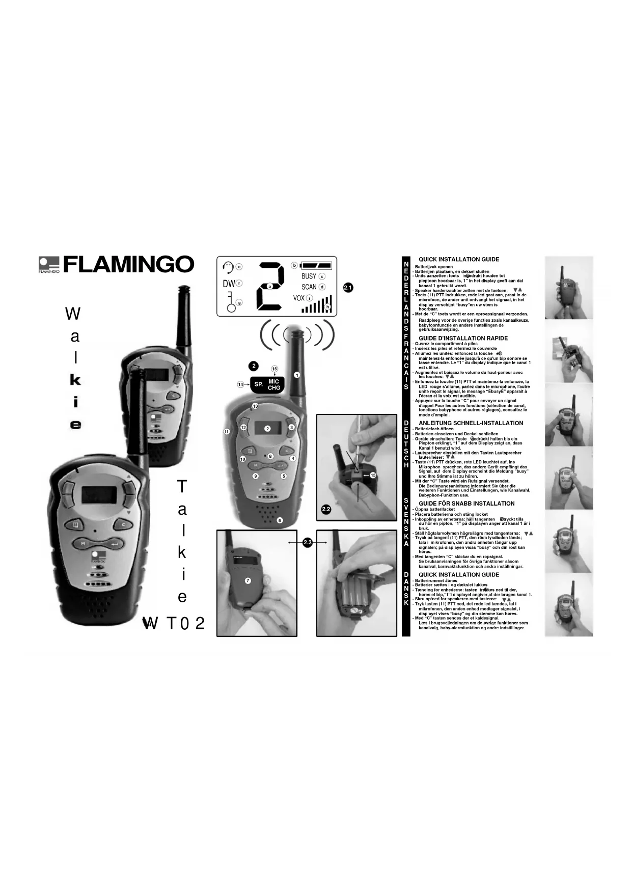 Téléchargez la notice de votre Talkie-walkie au format PDF gratuitement ! Retrouvez votre notice WT02 - Flamingo et reprennez votre appareil électronique en main. Sur cette page sont publiés tous les documents nécessaires à l'utilisation de votre appareil WT02 de la marque Flamingo.