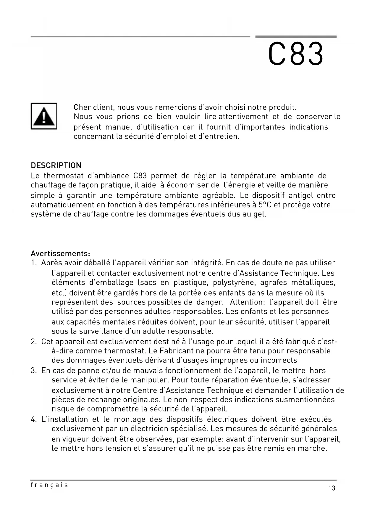 RESET f r a n ç a i s16 Le constructeur peut introduire, sans préavis et à tout moment, des modifications au produit décrit dans ces Notice d’utilisation, par consequént à la constant recherche du développement technologique et normatif du produit. On a transcrit les caractéristiques techniques et des codes du produit avec le plus grand soin. On n’a pas la responsabilité de fautes éventuelles. Le Thermostat ne requiert en général aucun entretien particulier. Le cas échéant, il suffit d’éliminer la poussière à l’aide d’un chiffon doux et sec ou, si nécessaire, impré- gné d’eau tiède et de détergent neutre. DONNéE TECHNIQUES Dimensions (LxHxP mm): 111x81,9x26 Alimentation: 2x1,5 V LR03 AAA Intervalle température de contrôle: +5°C / +35°C Intervalle température de lecture: +0°C / +40°C Pas de réglage: 0,5°C Capacité contacts (commutateur) - Charge ohmique: max 6 A 250 Vac 50 Hz - Charge inductive cosφ=0,6: max 2 A 250 Vac 50 Hz Sortie: libre de potentiel Mode de fonctionnement: Chauffage Vitesse ventilateur: - Antigel automatique: +5°C Température ambiante: +0°C / +40°C Différentiel: 0,4 / 0,6°C Précision température: +/- 1°C a 20°C Résolution: 0,1°C Aggiornamento lettura temperatura: toutes les 10 secondes Programmation: - Classe/Catégorie de protection : II Type/Degré de protection : IP30 Appareil conforme aux Directives 89/336/ CEE + 92/31/ CEE + 93/68/ CEE sur la Compatibilité Électromagnétique (EMC EN 55014-1, EN 55014-2, EN 61000-3-2, EN 61000-3-3) et sur la Basse Tension (Standard EN 60730-1, EN 60730-2-7, EN 60730-2- 9). Sous réserve de modifications techniques. ENTRETIEN f r a n ç a i s17 C83 Sehr geehrter Kunde, Vielen Dank für die Wahl eines Produkts unserer Herstellung. Wir möchten Sie bitten, diese Bedienungsanleitung aufmerksam zu lesen und aufzubewahren, da sie wichtige Hinweise zu Gebrauch, Sicherheit und Wartung des Geräts enthält. BESCHREIBUNG Über den Raumthermostat C83 kann die Heizfunktion ganz einfach gesteuert werden, wird Energie gespart und stets eine angenehme Raumtemperatur gewährleistet. Das Entfrostungsgerät schaltet sich automatisch bei Temperaturen unter 5°C zu und schützt Ihr Heizsystem vor etwaigen Frostschäden. Allgemeine Hinweise: