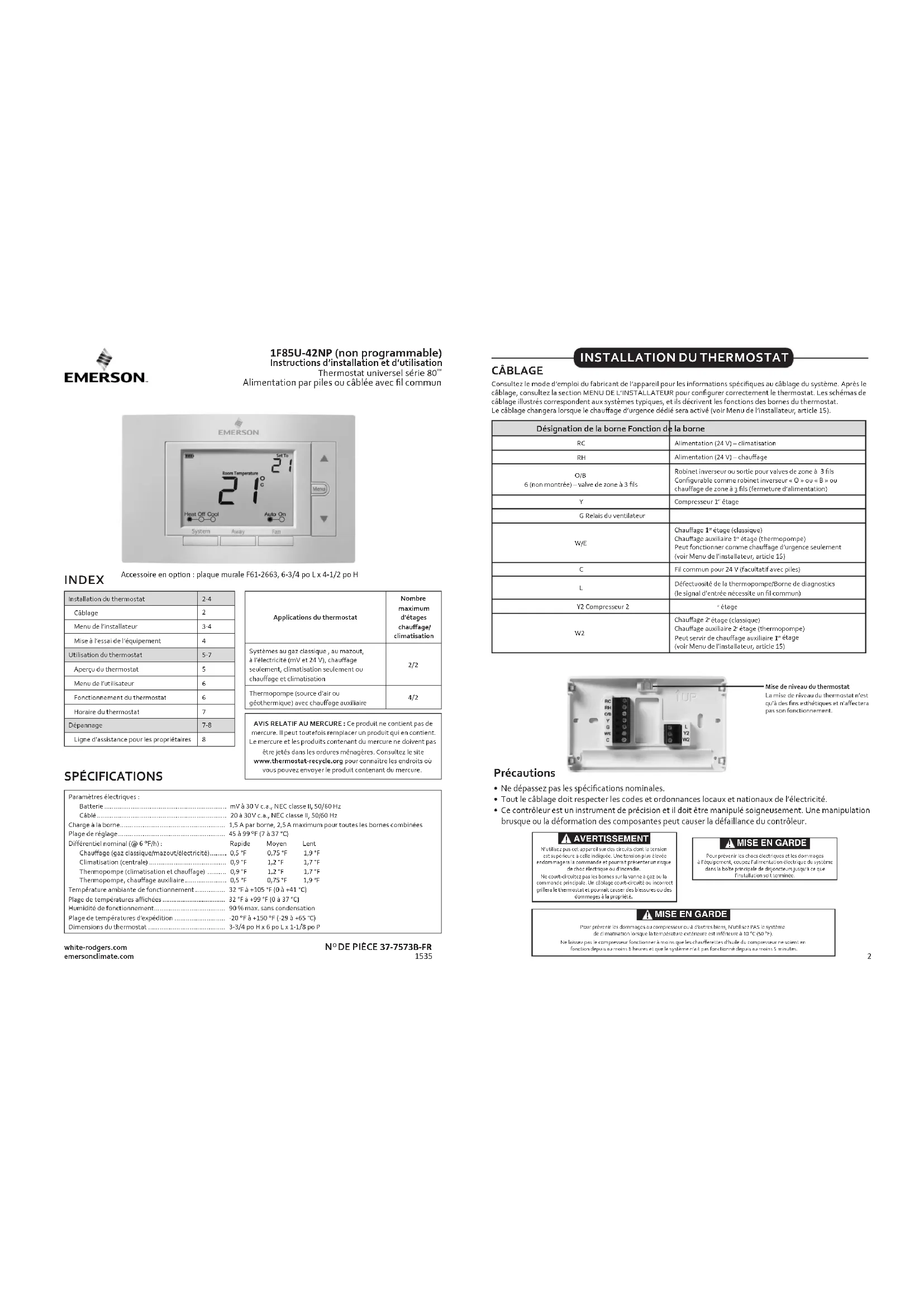 Alimentation par piles ou câblée avec l commun white-rodgers.comemersonclimate.comApplications du thermostat Nombre maximum d’étages chauage/climatisation Systèmes au gaz classique , au mazout, à l’électricité (mV et 24 V), chauage seulement, climatisation seulement ou chauage et climatisation 2/2 Thermopompe (source d’air ou géothermique) avec chauage auxiliaire 4/2 Installation du thermostat 2-4 Câblage Menu de l’installateur 3-4 Mise à l’essai de l’équipement Utilisation du thermostat 5-7 Aperçu du thermostat Menu de l’utilisateur Fonctionnement du thermostat Horaire du thermostat Dépannage 7-8 Ligne d’assistance pour les propriétaires
