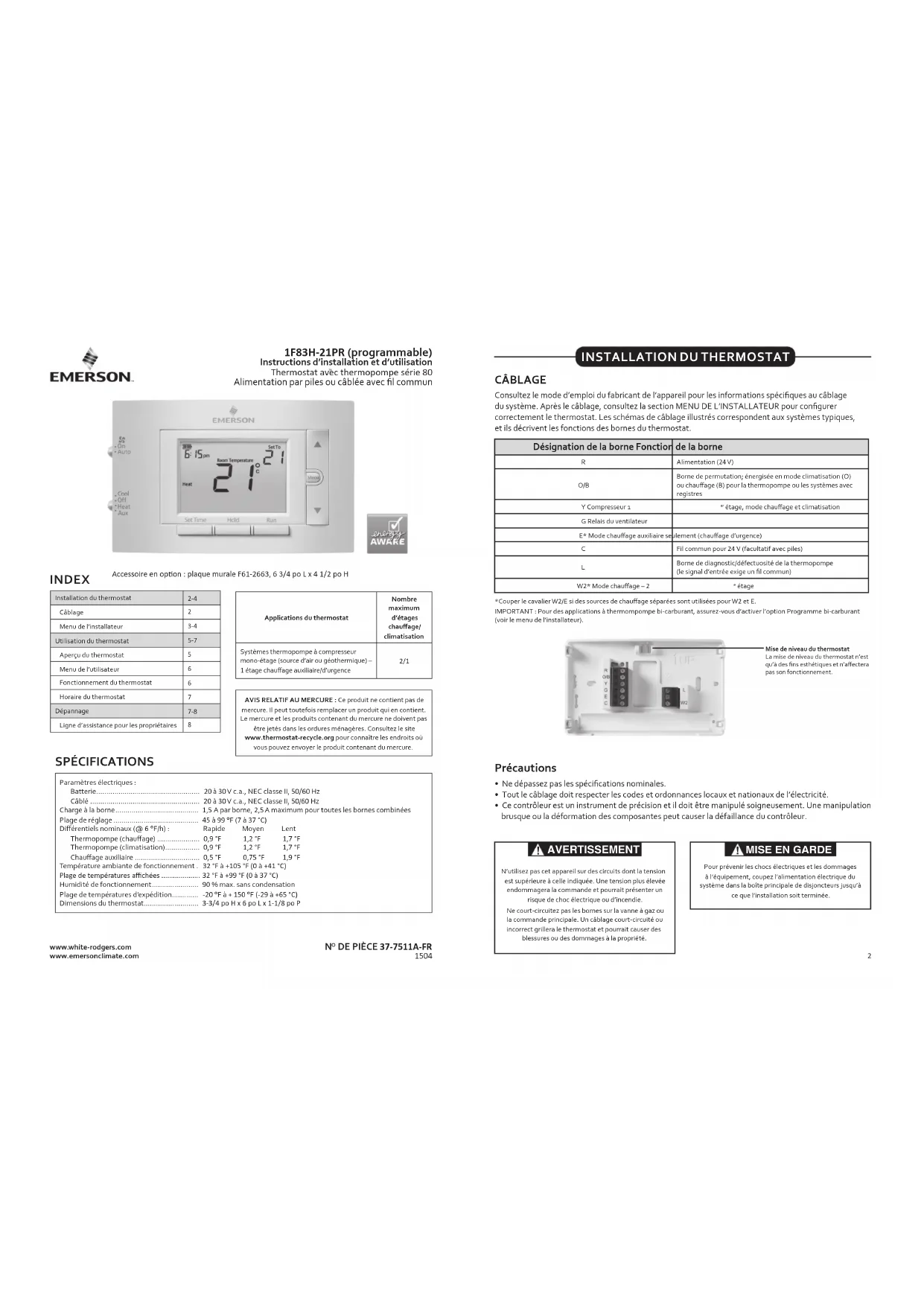 1F83H-21PR (programmable) Instructions d’installation et d’utilisation Thermostat avec thermopompe série 80 Alimentation par piles ou câblée avec l commun www.white-rodgers.com www.emersonclimate.com Applications du thermostat Nombre maximum d’étages chauage/climatisationSystèmes thermopompe à compresseur mono-étage (source d’air ou géothermique) – 1 étage chauage auxiliaire/d’urgence 2/1 Installation du thermostat 2-4 Câblage Menu de l’installateur 3-4 Utilisation du thermostat 5-7 Aperçu du thermostat Menu de l’utilisateur Fonctionnement du thermostat Horaire du thermostat Dépannage 7-8 Ligne d’assistance pour les propriétaires