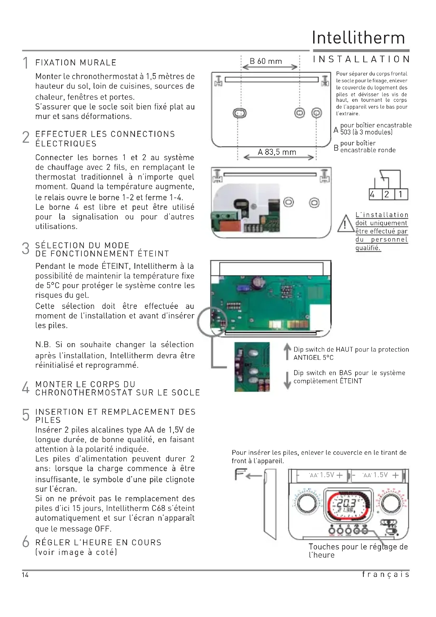 Conforme a las normas EN 60730-1 y segundas partes Capacidad contactos 5(3)A 250V.a.c. Microdesconexion (1BU) Software clase A. Contacto de conmutación libre de tensión. Regulación de la temperatura: CONFORT desde 16 hasta 34°C, AHORRO desde 5 hasta 23°C. Diferencial +/-0,25°C. Gradiente térmico de referencia 4°K/h. Apagado con posibilidad de protección anticongelante (5°C). programable con dip switch. Temperatura máxima ambiente T45. doble aislamiento. Grado de protección IP20. Grado de polución 2. Tensión de impulso 4000V. Alimentación sin conección a la linea eléctrica con 2 pilas alcalinas 1,5V tipo AA (duración 2 años). Control automatico del estado de la carga de las baterías con indicación en la pantalla en caso de carga insuficiente. Sustitución pilas sin pérdida de los datos programados. Desviador para el funcionamiento de invierno o verano. Tecla de reseteado para restablecer el programa. establecido de antemano. Dimensiones: 135x85x19 mm. Clasificación Erp: Clase ErP IV; 2% (Reg. EU 811/2013 - 813/2013)4 MONTER LE CORPS DU CHRONOTHERMOSTAT SUR LE SOCLE INSERTION ET REMPLACEMENT DES PILESInsérer 2 piles alcalines type AA de 1,5V de longue durée, de bonne qualité, en faisant attention à la polarité indiquée. Les piles d’alimentation peuvent durer 2 ans: lorsque la charge commence à être insuffisante, le symbole d’une pile clignote sur l’écran.Si on ne prévoit pas le remplacement des piles d’ici 15 jours, Intellitherm C68 s’éteint automatiquement et sur l’écran n’apparaît que le message OFF.Pour séparer du corps frontal le socle pour le fixage, enlever le couvercle du logement des piles et dévisser les vis de haut, en tournant le corps de l’appareil vers le bas pour l’extraire. EFFECTUER LES CONNECTIONS ÉLECTRIQUESConnecter les bornes 1 et 2 au système de chauffage avec 2 fils, en remplaçant le thermostat traditionnel à n’importe quel moment. Quand la température augmente, le relais ouvre le borne 1-2 et ferme 1-4.Le borne 4 est libre et peut être utilisé pour la signalisation ou pour d’autres utilisations. SÉLECTION DU MODE DE FONCTIONNEMENT ÉTEINTPendant le mode ÉTEINT, Intellitherm à la possibilité de maintenir la température fixe de 5°C pour protéger le système contre les risques du gel.Cette sélection doit être effectuée au moment de l’installation et avant d’insérer les piles.N.B. Si on souhaite changer la sélection après l’installation, Intellitherm devra être réinitialisé et reprogrammé. Dip switch de HAUT pour la protection ANTIGEL 5°CDip switch en BAS pour le système complètement ÉTEINT FIXATION MURALEL’installation doit uniquement être effectué par du personnel qualifié.Monter le chronothermostat à 1,5 mètres de hauteur du sol, loin de cuisines, sources de chaleur, fenêtres et portes. S’assurer que le socle soit bien fixé plat au mur et sans déformations. pour boîtier encastrable 503 (à 3 modules)pour boîtier encastrable ronde