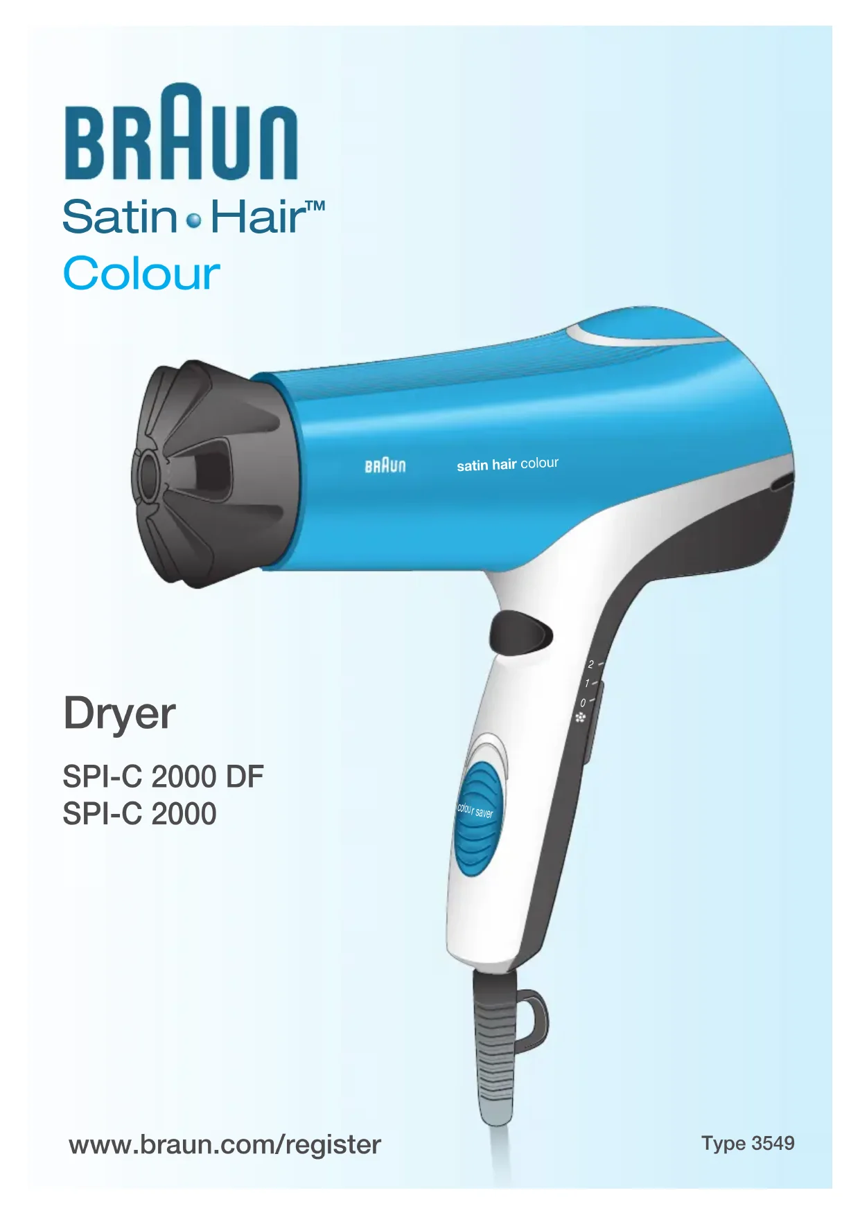 English 98575691_SPI_C_2000_S4-62.indd 698575691_SPI_C_2000_S4-62.indd 6 27.02.2008 10:49:25 Uhr27.02.2008 10:49:25 Uhr7 Volume styling ... short to mid-length hair: To add volume and root lift, gently guide the diffusor fingers with a small circular motion over your scalp. Continue section by section. ... long hair: First dry hair ends by placing them onto the finger plate. Then, with the diffusor, carefully lift the hair to your head and hold. Finish off the roots with a gentle circular movement of the diffusor fingers on the scalp to add some lift. Subject to change without notice. This product conforms to the European Directives EMC 2004/108/EC and Low Voltage 2006/95/EC. Please do not dispose of the product in the household waste at the end of its useful life. Disposal can take place at a Braun Service Centre or at appropriate collection points provided in your country. Guarantee We grant 2 years guarantee on the product commencing on the date of purchase. Within the guarantee period we will eliminate, free of charge, any defects in the appliance resulting from faults in materials or workmanship, either by repairing or replacing the complete appliance as we may choose. This guarantee extends to every country where this appliance is supplied by Braun or its appointed distributor. This guarantee does not cover: damage due to improper use, normal wear or use as well as defects that have a negligible effect on the value or operation of the appliance. The guarantee becomes void if repairs are undertaken by unauthorised persons and if original Braun parts are not used. To obtain service within the guarantee period, hand in or send the complete appliance with your sales receipt to an authorised Braun Customer Service Centre. For UK only: This guarantee in no way affects your rights under statutory law. 98575691_SPI_C_2000_S4-62.indd 798575691_SPI_C_2000_S4-62.indd 7 27.02.2008 10:49:25 Uhr27.02.2008 10:49:25 Uhr8 Français Les procédés de pointe de fabrication de nos produits réunissent au plus haut niveau qualité, fonctionnalité et design. C’est ainsi que vous pourrez pleinement apprécier ce nouvel appareil Braun. Avant la première utilisation de cet appareil, prenez le temps de lire le mode d’emploi complètement et attentivement. Important Branchez votre appareil uniquement sur courant alternatif (쓒) et assurez vous que la tension correspond bien à celle indiquée sur votre appareil. Cet appareil ne doit jamais être utilisé sous la douche ou à proximité de l’eau (ex. au dessus d’un évier ou d’une baignoire remplie d’eau). Ne jamais laisser l‘appareil se mouiller. Débranchez systématiquement après utilisation. Même s’il est arrêté, l’appareil présente toujours un risque quand il est à proximité d’eau. Pour une protection supplémentaire, il est con- seillé de faire installer un disjoncteur différentiel n‘excédant pas 30 mA de courant de fuite maximum admis dans le circuit d‘alimentation de sa salle de bains. Demander conseil à son installateur. Prendre soin de ne pas obstruer les grilles d’ar- rivée et de sortie d’air lorsque le sèche-cheveux fonctionne. Si l’une de celles-ci est obstruée, le sèche-cheveux s‘arrête automatiquement. Après un refroidissement de quelques minutes, il se remettra en marche automatiquement. Ne pas enrouler le cordon autour du sèche- cheveux. Vérifier régulièrement que le cordon n‘est ni usé, ni endommagé, en particulier au niveau de sa fixation au sèche-cheveux ainsi qu‘à la prise. Si vous avez un doute quelconque sur l‘état du cordon, le faire vérifier ou réparer par un centre-service agréé Braun. Le cordon ne doit être remplacé que par un centre-service agréé Braun car une réparation non qualifiée peut entrainer des dommages pour l’utilisateur. Cet appareil n’est pas destiné à des enfants ou à des personnes aux capacités mentales et physiques réduites à moins qu’elles ne soient sous la surveillance d’un adulte responsable de leur sécurité. Mais de manière générale nous recommandons de maintenir cet appareil hors de portée des enfants. Description 1 Interrupteur / réglage 2 Touche lumineuse Colour Saver 3 Touche air froid 4 Filtre de protection 5 Embout Colour Saver