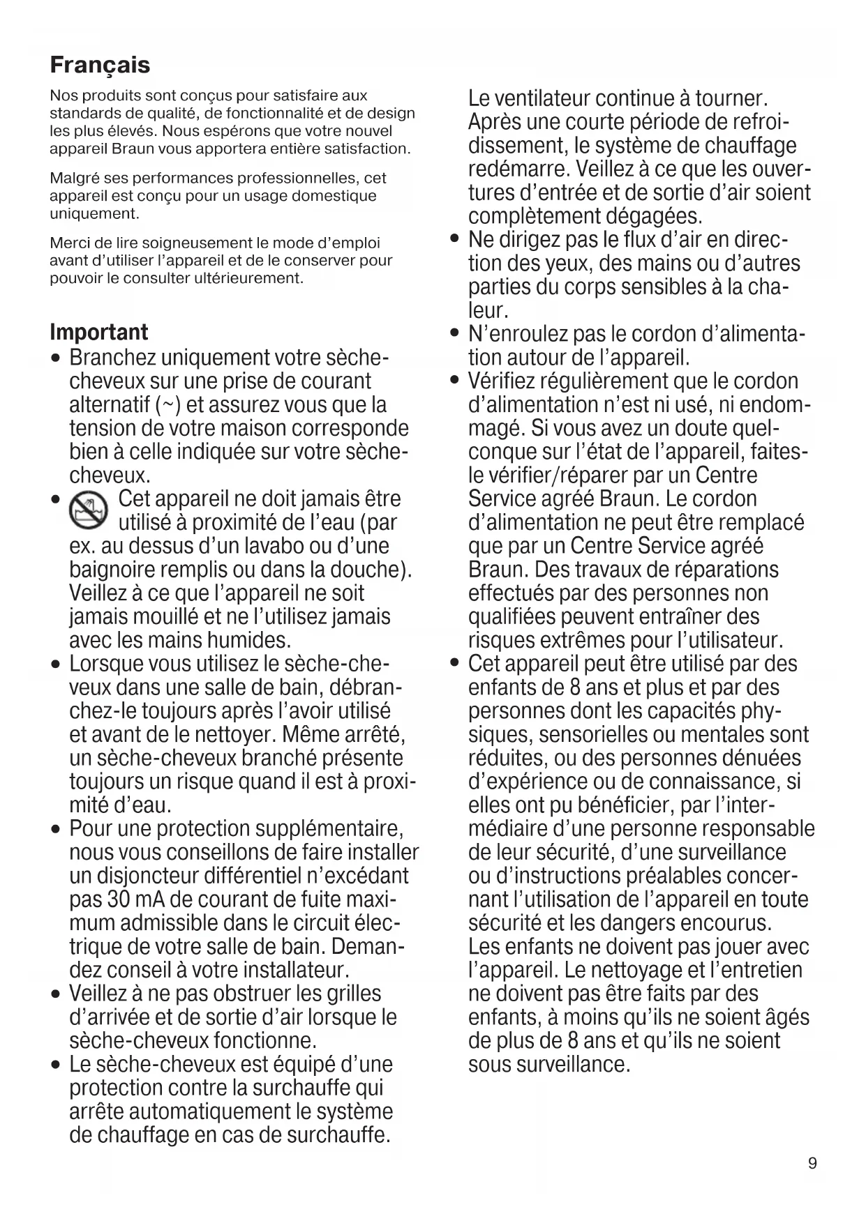 Vérifiez régulièrement que le cordon d’alimentation n’est ni usé, ni endom- magé. Si vous avez un doute quel- conque sur l’état de l’appareil, faites- le vérifier/réparer par un Centre Service agréé Braun. Le cordon d’alimentation ne peut être remplacé que par un Centre Service agréé Braun. Des travaux de réparations effectués par des personnes non qualifiées peuvent entraîner des risques extrêmes pour l’utilisateur.