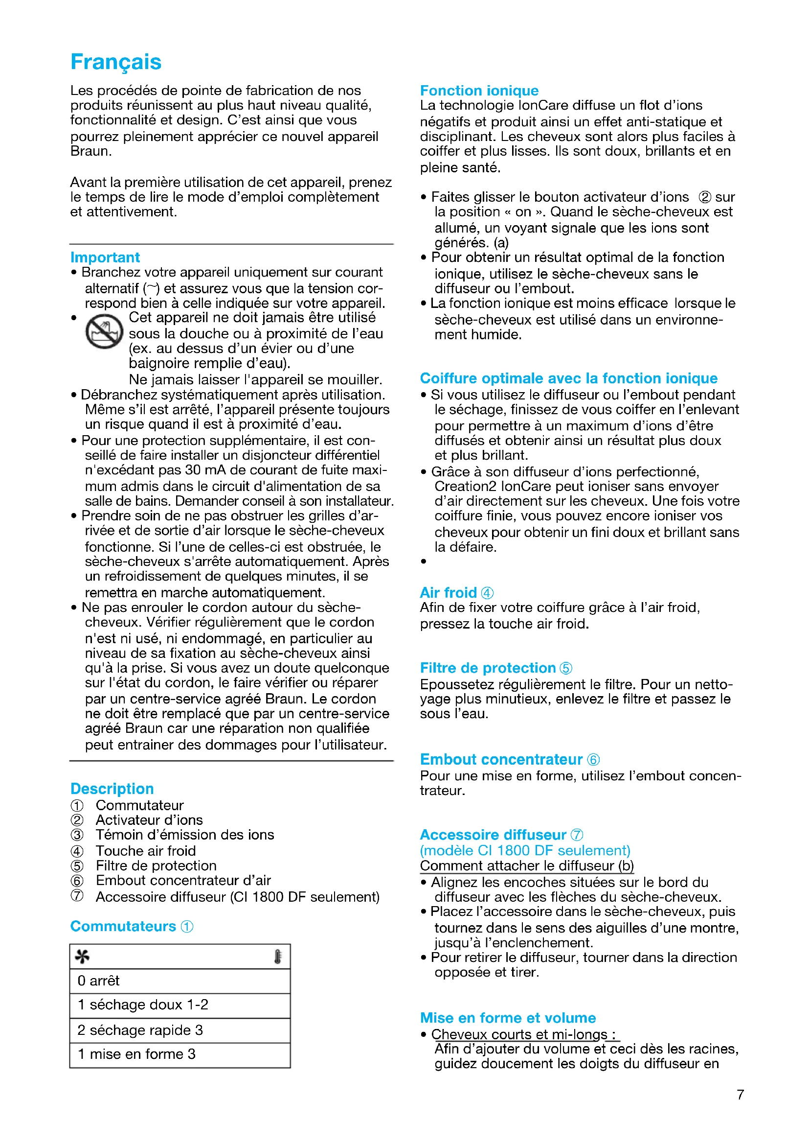 Creation 2 CI 1800 - Sèche-cheveux BRAUN - Notice d'utilisation et mode d'emploi gratuit
