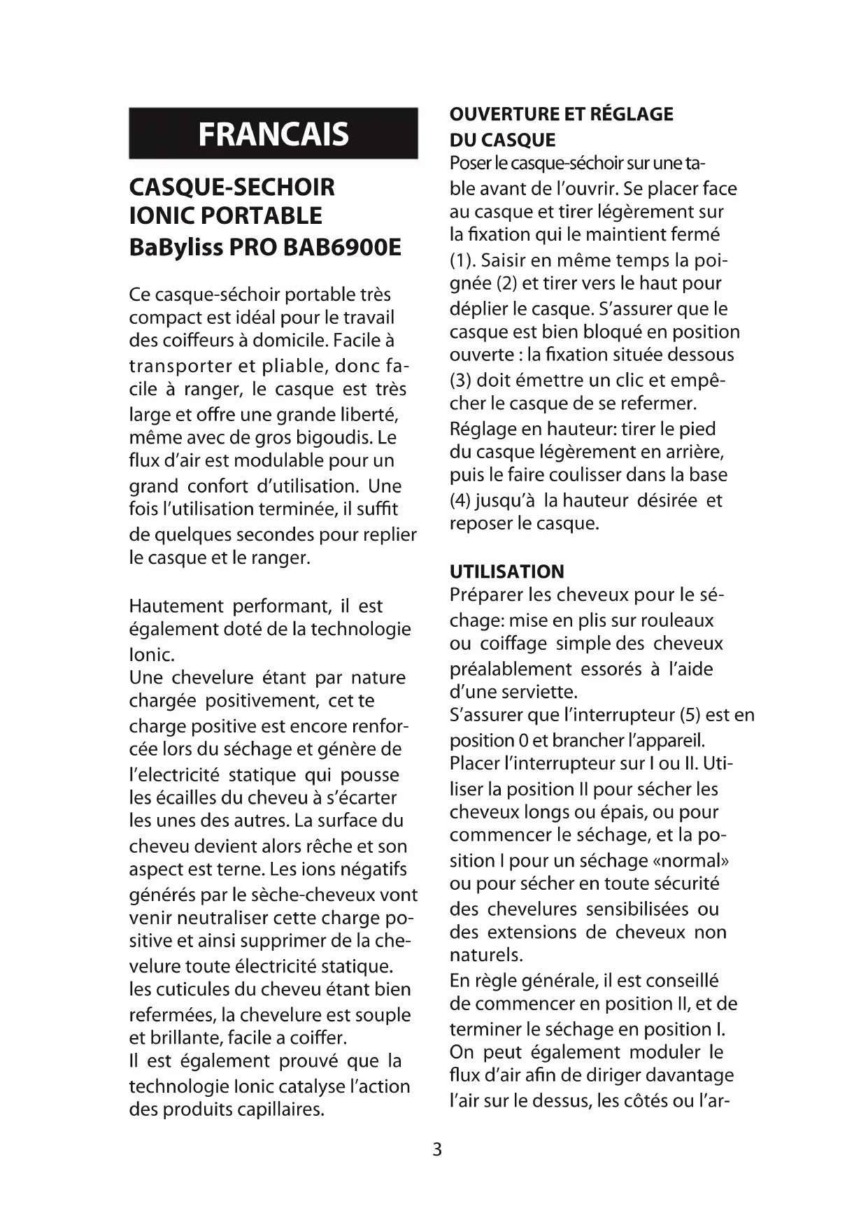 DU CASQUE Poser le casque-séchoir sur une ta- ble avant de l’ouvrir. Se placer face au casque et tirer légèrement sur la fixation qui le maintient fermé (1). Saisir en même temps la poi- gnée (2) et tirer vers le haut pour déplier le casque. S’assurer que le casque est bien bloqué en position ouverte : la fixation située dessous (3) doit émettre un clic et empê- cher le casque de se refermer. Réglage en hauteur: tirer le pied du casque légèrement en arrière, puis le faire coulisser dans la base (4) jusqu’à la hauteur désirée et reposer le casque. UTILISATION Préparer les cheveux pour le sé- chage: mise en plis sur rouleaux ou coiffage simple des cheveux préalablement essorés à l’aide d’une serviette. S’assurer que l’interrupteur (5) est en position 0 et brancher l’appareil. Placer l’interrupteur sur I ou II. Uti- liser la position II pour sécher les cheveux longs ou épais, ou pour commencer le séchage, et la po- sition I pour un séchage «normal» ou pour sécher en toute sécurité des chevelures sensibilisées ou des extensions de cheveux non naturels. En règle générale, il est conseillé de commencer en position II, et de terminer le séchage en position I. On peut également moduler le flux d’air afin de diriger davantage l’air sur le dessus, les côtés ou l’ar- FRANCAIS4 rière de la tête, en fonction de la coiffure. Pour cela, il suffit de tourner la poignée vers la gauche ou vers la droite pour ouvrir ou fermer les ouvertures d’aération (6) et faire varier la distribution de l’air dans le casque.