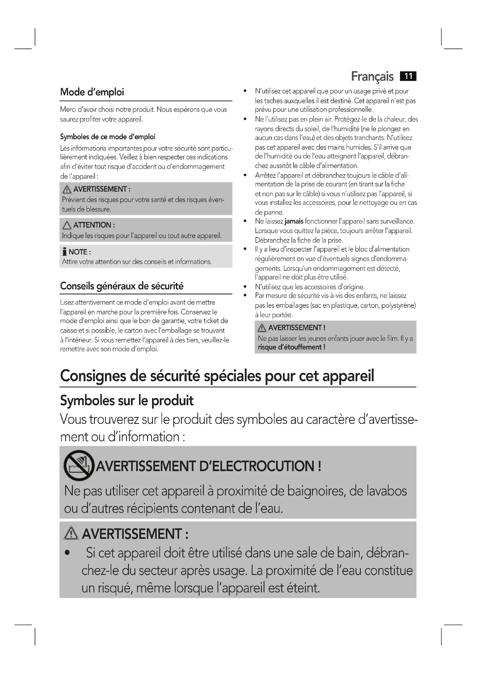 Consignes de sécurité spéciales pour cet appareil
