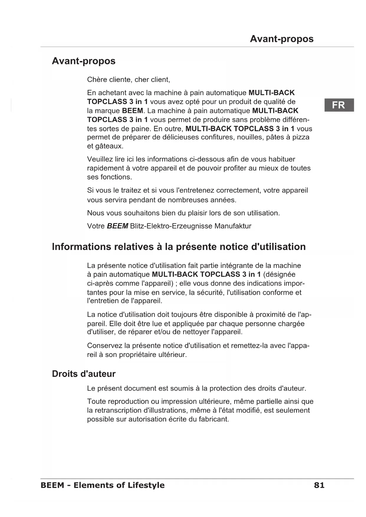 La presente notice d'utilisation fait partie intégrante de la machine à pain automatique MULTI-BACK TOPCLASS 3 in 1 (désignée ci-après comme l'appareil); elle vous donne des indications importantes pour la mise en service, la sécurité, l'utilisation conforme et l'entretien de l'appareil.