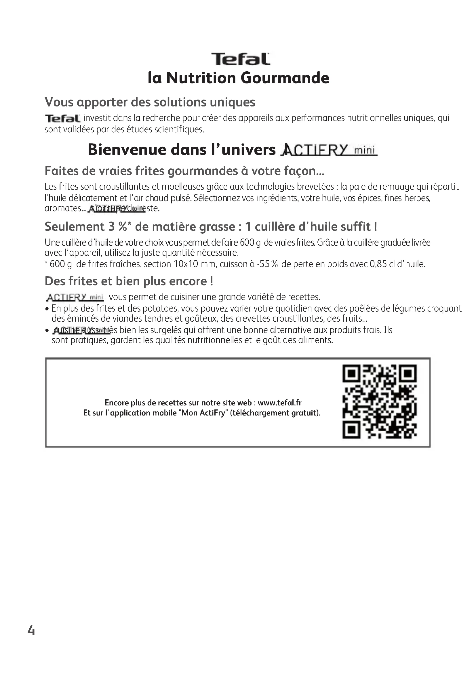 Retrouvez gratuitement la notice de l'appareil ActiFry Mini FZ2000 TEFAL au format PDF.