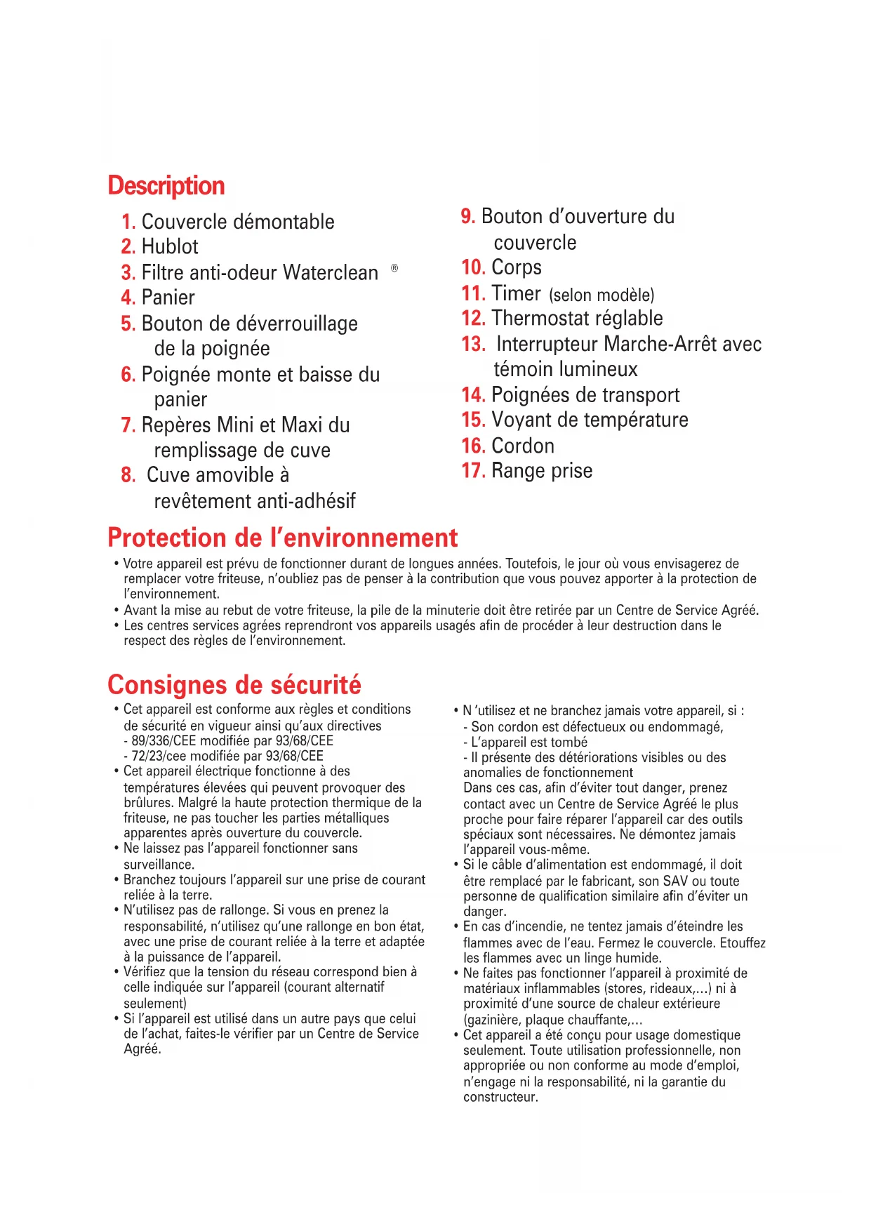 - Votre appareil est prévu de fonctionner durant de longues années. Toutefois, le jour où vous envisagerez de remplacer votre friteuse, n’oubliez pas de penser à la contribution que vous pouvez apporter à la protection de l’environnement.