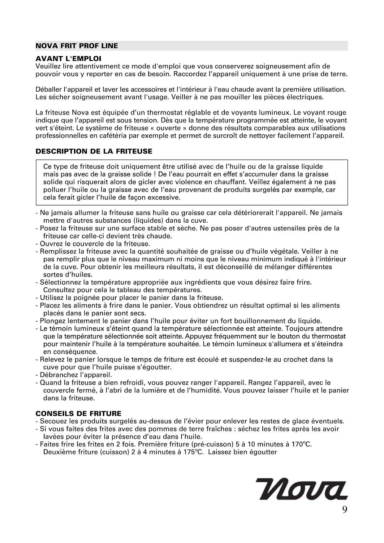 AVANT L'EMPLOI Veuillez lire attentivement ce mode d'emploi que vous conserverez soigneusement afin de pouvoir vous y reporter en cas de besoin. Raccordez l’appareil uniquement à une prise de terre. Déballer l'appareil et laver les accessoires et l'intérieur à l'eau chaude avant la première utilisation. Les sécher soigneusement avant l'usage. Veiller à ne pas mouiller les pièces électriques. La friteuse Nova est équipée d’un thermostat réglable et de voyants lumineux. Le voyant rouge indique que l’appareil est sous tension. Dès que la température programmée est atteinte, le voyant vert s'éteint. Le système de friteuse « ouverte » donne des résultats comparables aux utilisations professionnelles en cafétéria par exemple et permet de surcroît de nettoyer facilement l’appareil.