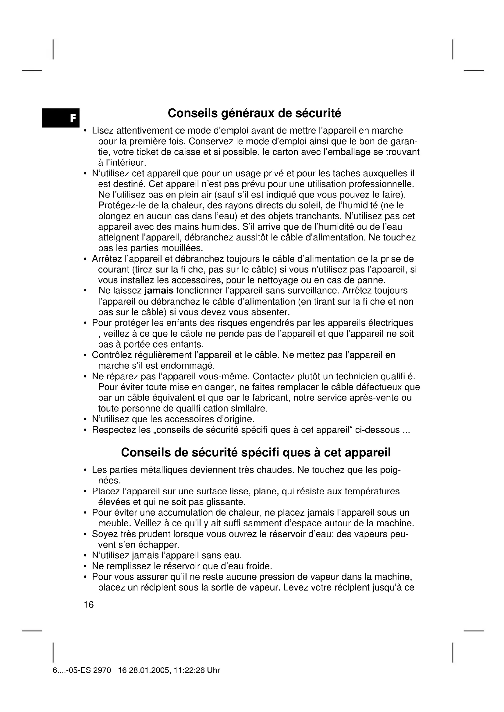 - Humidifi ez de temps en temps le joint de l’ouverture du réservoir et du porte-fi ltre avec de l’huile végétale. Cet appareil a été contrôlé d’après toutes les directives européennes actuelles applicables, comme par exemple concernant la compatibilité électromagnétique et la basse tension. Cet appareil a été fabriqué en respect des réglementations techniques de sécurité les plus récentes. Sous réserve de modifi cations techniques. 6....-05-ES 2970 20 28.01.2005, 11:22:29 UhrF