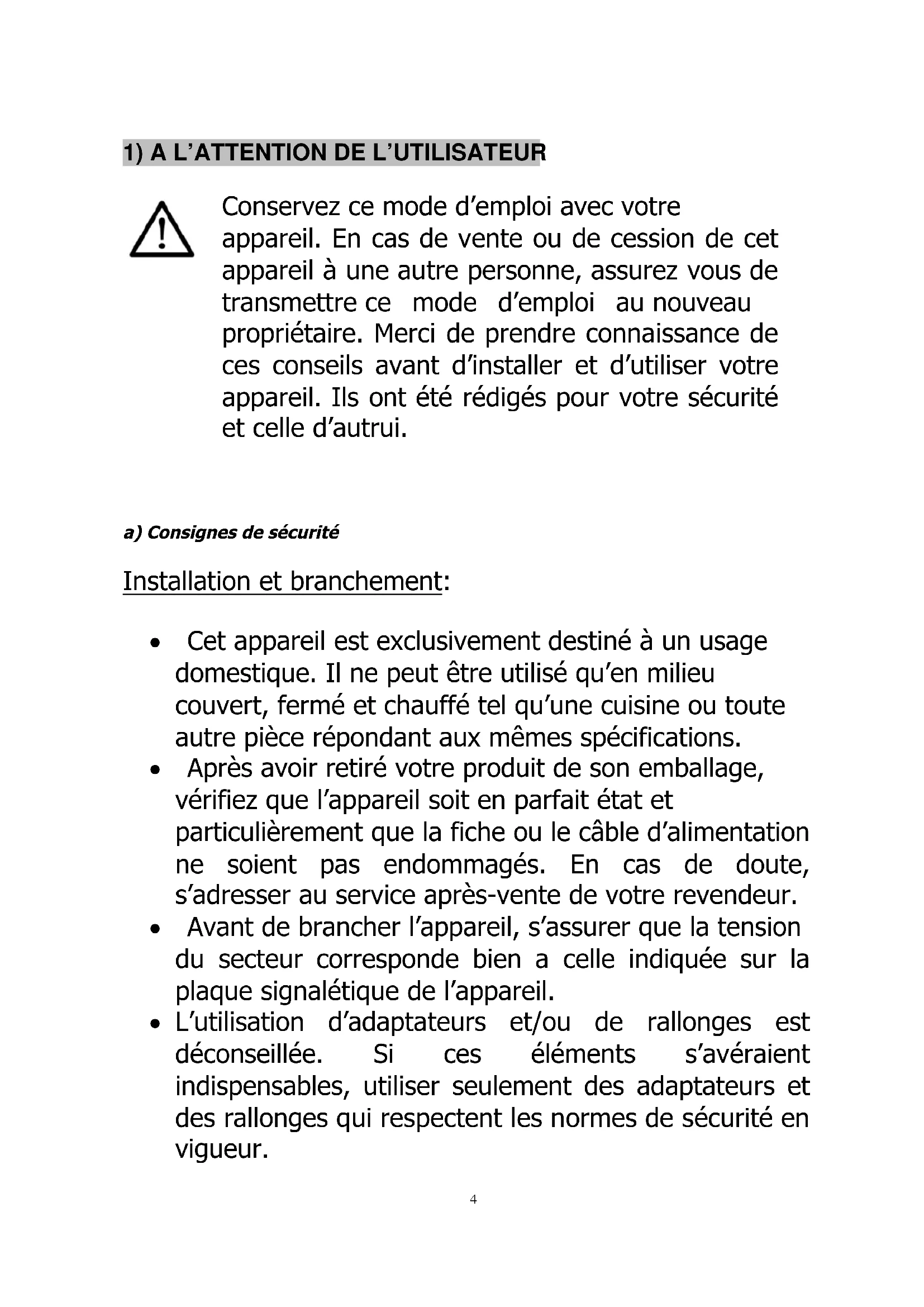 a) Consignes de sécurité Installation et branchement: Cet appareil est exclusivement destiné à un usage domestique. Il ne peut être utilisé qu’en milieu couvert, fermé et chauffé tel qu’une cuisine ou toute autre pièce répondant aux mêmes spécifications. Après avoir retiré votre produit de son emballage, vérifiez que l’appareil soit en parfait état et particulièrement que la fiche ou le câble d’alimentation ne soient pas endommagés. En cas de doute, s’adresser au service après-vente de votre revendeur. Avant de brancher l’appareil, s’assurer que la tension du secteur corresponde bien a celle indiquée sur la plaque signalétique de l’appareil. L’utilisation d’adaptateurs et/ou de rallonges est déconseillée. Si ces éléments s’avéraient indispensables, utiliser seulement des adaptateurs et des rallonges qui respectent les normes de sécurité en vigueur. Conservez ce mode d’emploi avec votre appareil. En cas de vente ou de cession de cet appareil à une autre personne, assurez vous de transmettre ce mode d’emploi au nouveau propriétaire. Merci de prendre connaissance de