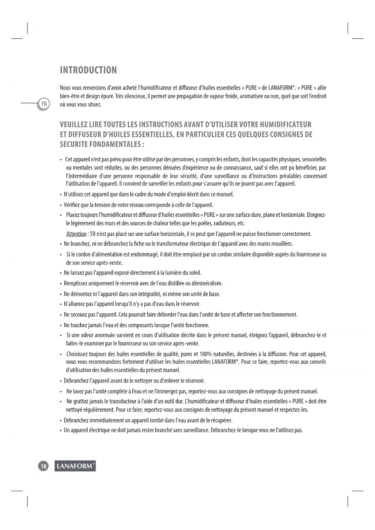 INTRODUCTION Nous vous remercions d’avoir acheté l’humidicateur et diuseur d’huiles essentielles « PURE » de LANAFORM®. « PURE » allie bien-être et design épuré. Très silencieux, il permet une propagation de vapeur froide, aromatisée ou non, quel que soit l’endroit où vous vous situez. VEUILLEZ LIRE TOUTES LES INSTRUCTIONS AVANT D’UTILISER VOTRE HUMIDIFICATEUR ET DIFFUSEUR D’HUILES ESSENTIELLES, EN PARTICULIER CES QUELQUES CONSIGNES DE SECURITE FONDAMENTALES :