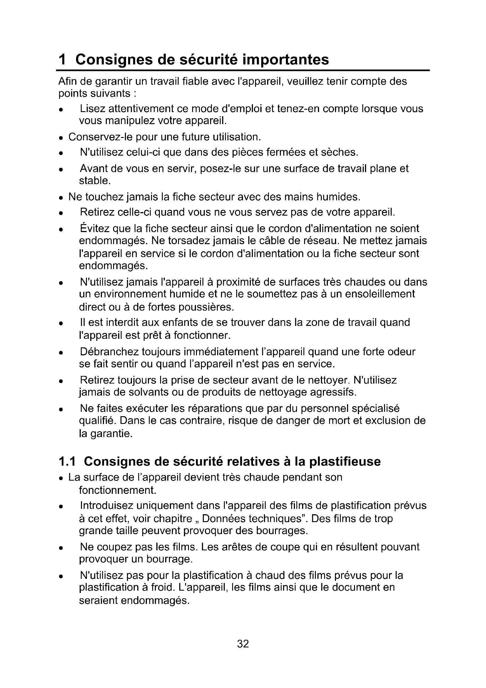 1.1 Consignes de sécurité relatives à la plastifieuse ..................... 32