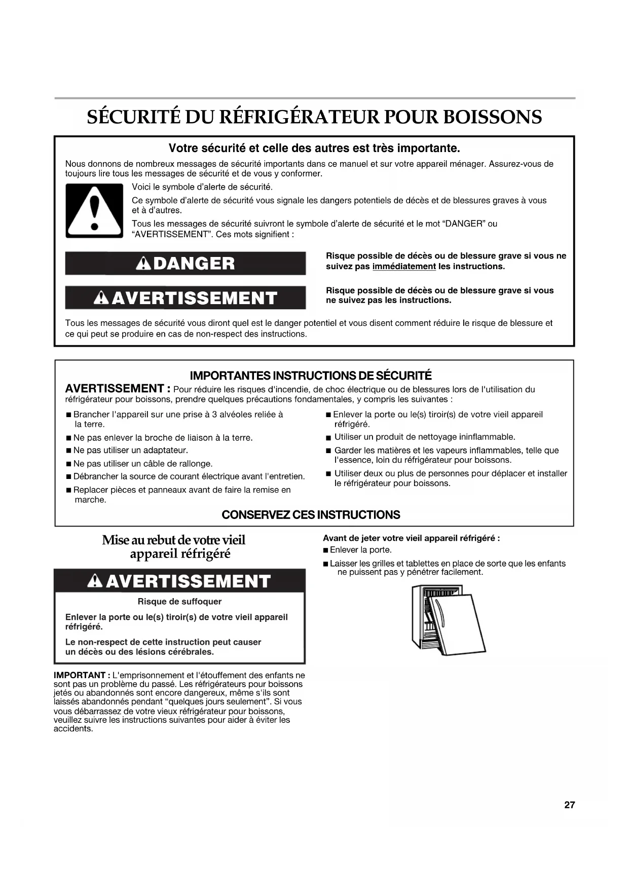 SÉCURITÉ DU RÉFRIGÉRATEUR POUR BOISSONS ...........................27 Mise au rebut de votre vieil appareil réfrigéré ........................................27