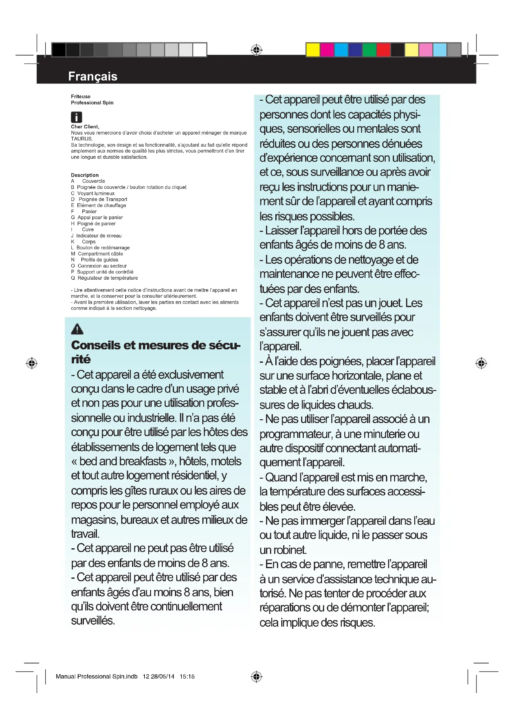 And, depending on whether it spatters upwards, something like this could even also be included: Carefully remove the lid to prevent accidental contact with possible left-over hot oil which may remain at its top part. Once you have nished using the appliance: - Select the minimum position (MIN) using the thermostat control. - Unplug the appliance from the mains. - Put the cable back in the cable housing. -Place the basket in the bowl. -Thebaskethandlecanbeleftxedorfoldedtowardsthebasketbypressing the bar to the side and turning it. -Put the lid on the appliance. Cable compartment - This appliance has a cable compartment situated on its underside. Carry handles: - This appliance has a handle on the side of the body, which facilitates comfor- table transport . Practical recommendations: - Fry a few pieces of bread to remove the smell of used oil. - For food with a high water content, it is better and quicker to fry in two lots with less food than in just one. This will reduce the risk of splashes and spillage. - The “two-stage frying method” can be used for an even and crispy coating. Thissystemconsistsofrstfryingthefooduntilitisreasonablywelldoneand then frying again using very hot oil to brown the food. - Olive oil with a minimum acidity level is recommendable for frying. - Do not mix different oils. - Wash potatoes before frying to stop them from sticking Safety thermal protector: - The appliance has a safety device, which protects the appliance from overheating. - In the event of overheating, the thermal safety mechanism will be activated and the appliance will stop operating. When this occurs the appliance should be disconnected from the mains and left to cool. Then press the rearming button, situated at the back of the electrical circuit, with the tip of a pen or similar in order to reactivate the appliance (Fig.5). Cleaning - Disconnect the appliance from the mains and allow it to cool before underta- king any cleaning task. - Disassemble the appliance in accordance with the following steps: Remove the lid. Remove the basket and take out the electrical equipment. Remove the bowl. Carefully pour the used oil from the bowl into a container (not the sink), accor- ding to the regulations in force for the treatment and disposal of waste. Turn the body of the fryer and dismount the connection from the mains pressing on the clip and pulling outwards. Unplug the mains cable from the its housing and separate from the fryer. - Except for the power unit and the mains connection, all the parts can be cleaned with detergent and water or in washing up liquid. Rinse thoroughly to remove all traces of detergent. - Clean the electrical equipment and the mains connection with a damp cloth and dry. DO NOT IMMERSE IN WATER OR ANY OTHER LIQUID. - Clean the equipment with a damp cloth with a few drops of washing-up liquid and then dry. - Do not use solvents, or products with an acid or base pH such as bleach, or abrasive products, for cleaning the appliance. - It is advisable to clean the appliance regularly and remove any food remains. - The following pieces may be washed in a dishwasher (using a soft cleaning program): - Basket -Tank - The draining/drying position of the articles washable in the dishwasher or in the sink must allow the water to drain away easily . - Then dry all parts before its assembly and storage. Anomalies and repair - Take the appliance to an authorised technical support service if product is damaged or other problems arise. Do not attempt to disassemble or repair the appliance yourself as this may be dangerous. For EU product versions and/or in case that it is requested in your country: Ecology and recyclability of the product - The materials of which the packaging of this appliance consists are included in acollection,classicationandrecyclingsystem.Shouldyouwishtodisposeof them, use the appropriate public recycling bins for each type of material. - The product does not contain concentrations of substances that could be considered harmful to the environment. This symbol means that in case you wish to dispose of the product once its working life has ended, take it to an authorised waste agent for the selective collection of Waste from Electric and Electronic Equipment (WEEE). This appliance complies with Directive 2006/95/EC on Low Voltage, Directive 2004/108/EC on Electromagnetic Compatibility, Directive 2011/65/EC on the restrictions of the use of certain hazardous substances in electrical and electro- nic equipment and Directive 2009/125/EC on the ecodesign requirements for energy-related products. Manual Professional Spin.indb 11 28/05/14 15:15Français Friteuse Professional Spin Cher Client, Nous vous remercions d’avoir choisi d’acheter un appareil ménager de marque TAURUS. Sa technologie, son design et sa fonctionnalité, s’ajoutant au fait qu’elle répond amplement aux normes de qualité les plus strictes, vous permettront d’en tirer une longue et durable satisfaction. Description A Couvercle B Poignée du couvercle / bouton rotation du cliquet C Voyant lumineux D Poignée de Transport E Elément de chauffage F Panier G Appui pour le panier H Poigné de panier I Cuve J Indicateur de niveau K Corps L Bouton de redémarrage M Compartiment câble N Prolsdeguides O Connexion au secteur P Support unité de contrôlé Q Régulateur de température - Lire attentivement cette notice d’instructions avant de mettre l’appareil en marche, et la conserver pour la consulter ultérieurement. - Avant la première utilisation, laver les parties en contact avec les aliments comme indiqué à la section nettoyage. Conseils et mesures de sécu- rité - Cet appareil a été exclusivement conçu dans le cadre d’un usage privé et non pas pour une utilisation profes- sionnelle ou industrielle. Il n’a pas été conçu pour être utilisé par les hôtes des établissements de logement tels que « bed and breakfasts », hôtels, motels et tout autre logement résidentiel, y com