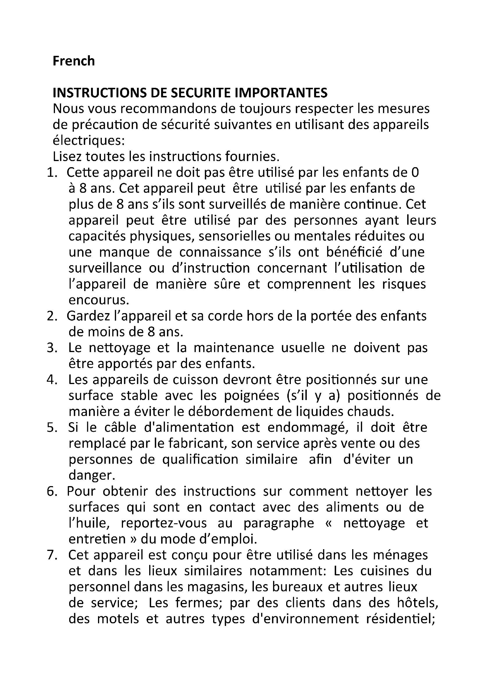 7. Cet appareil est conçu pour être utilisé dans les ménages