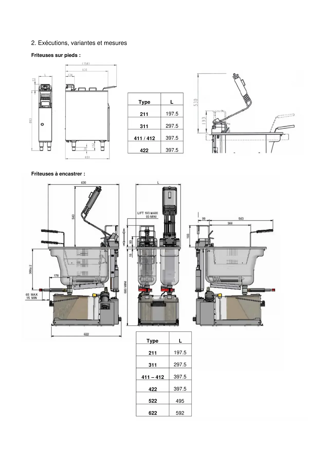 En cas de panne, adressez-vous à votre installateur ou le centre de réparation le plus proche. Cependant, avant d’appeler le monteur inutilement, veuillez contrôler : - si les fusibles du secteur sont intacts, - si la fiche électrique est bien connectée, - si la machine à été mise en marche correctement, - si le niveau d’huile est correct. Important ! Si vous faites appel au service de réparation, indiquez le type et le numéro de votre machine. Vous trouverez ces indications sur la plaquette signalétique appliquée sur le panneau derrière la porte.2. Executions and dimensions Floor standing fryers: