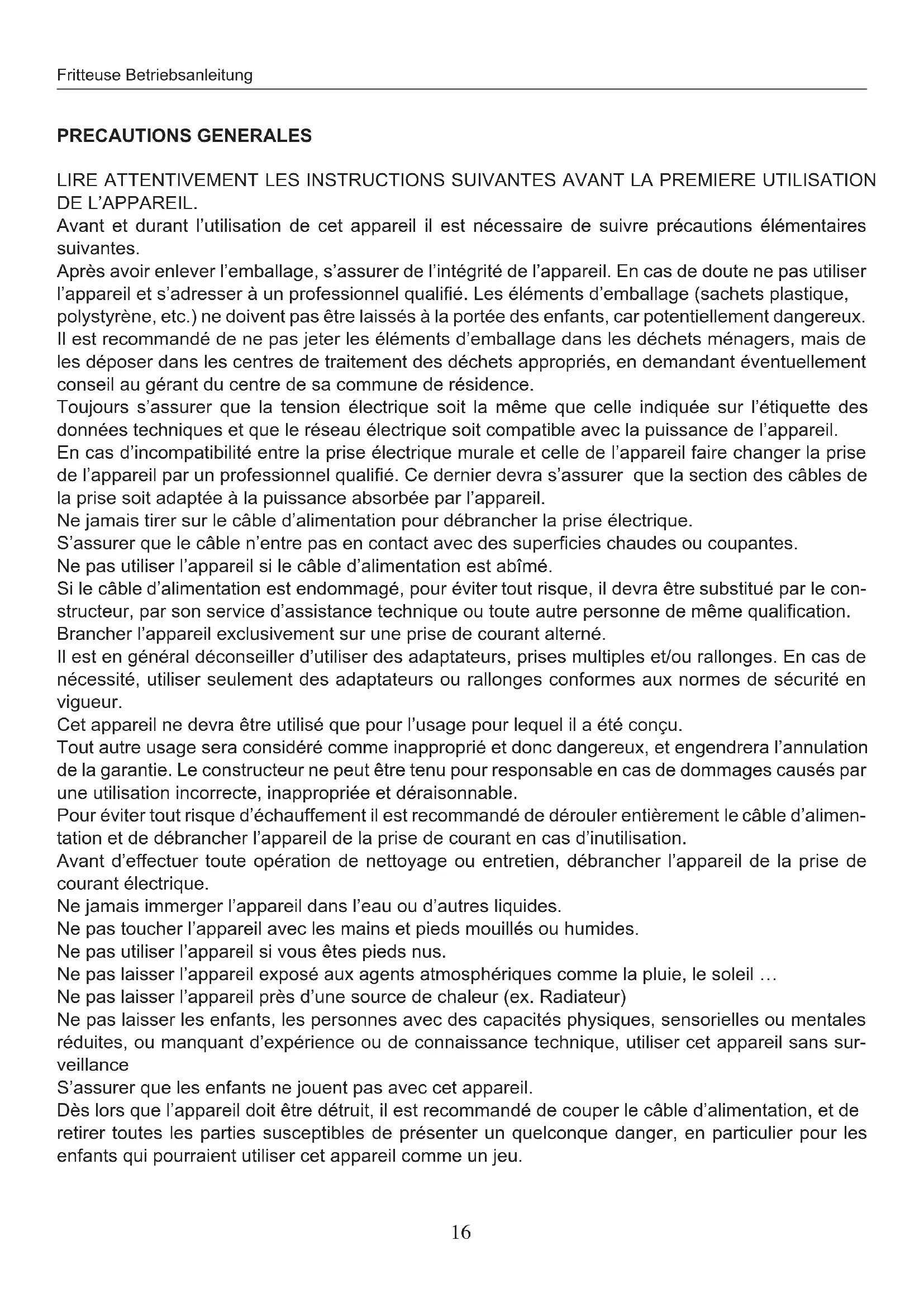 Cet apparéil a été unconçu pour la friture des alimentés exclusivement à usage domestique, il ne doit pas être utilisé pour à d'autres fins et ne doit enaucun cas être modifié ou manipulé.