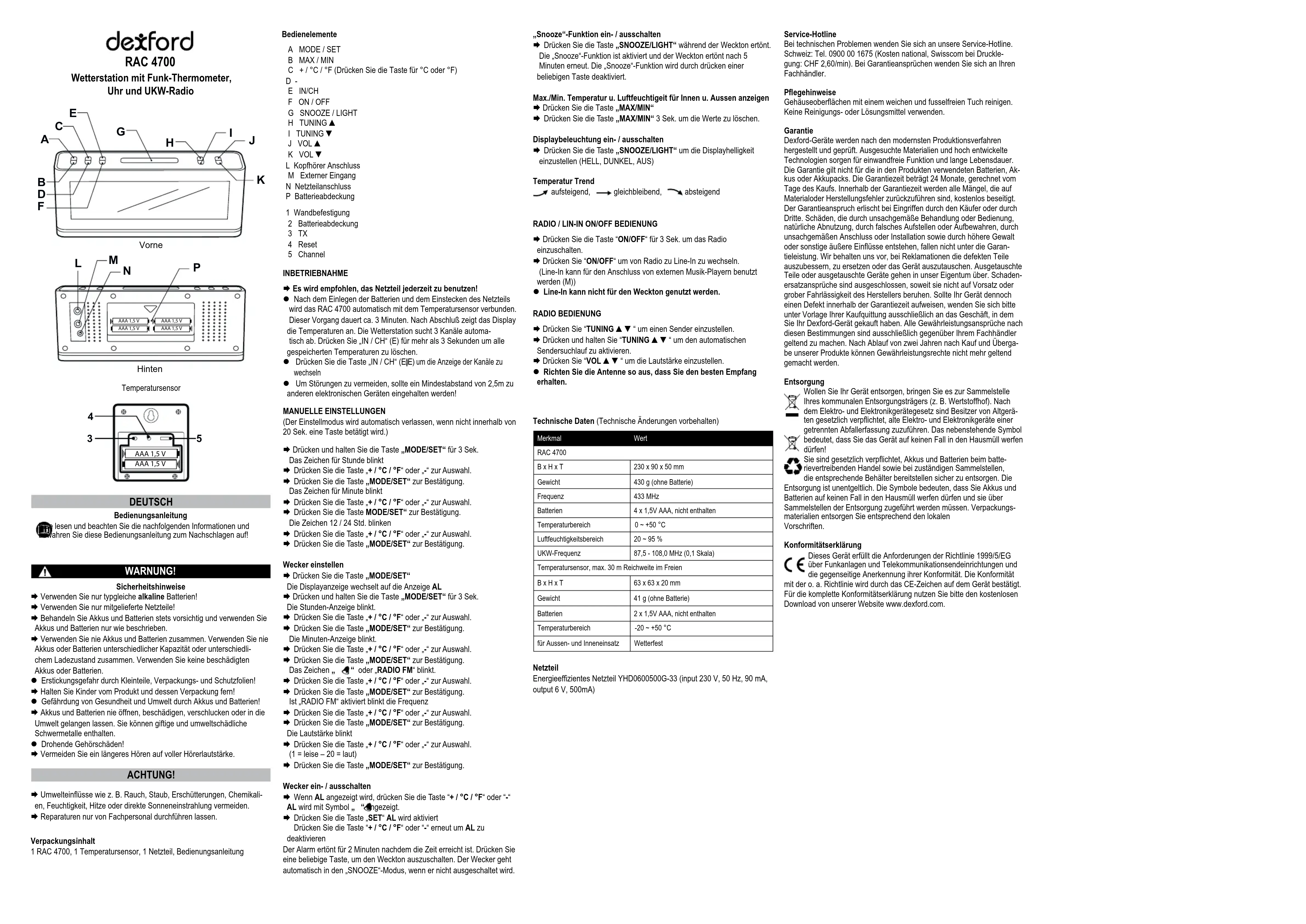 Téléchargez la notice de votre Station Météo au format PDF gratuitement ! Retrouvez votre notice RAC 4700 - Dexford et reprennez votre appareil électronique en main. Sur cette page sont publiés tous les documents nécessaires à l'utilisation de votre appareil RAC 4700 de la marque Dexford.