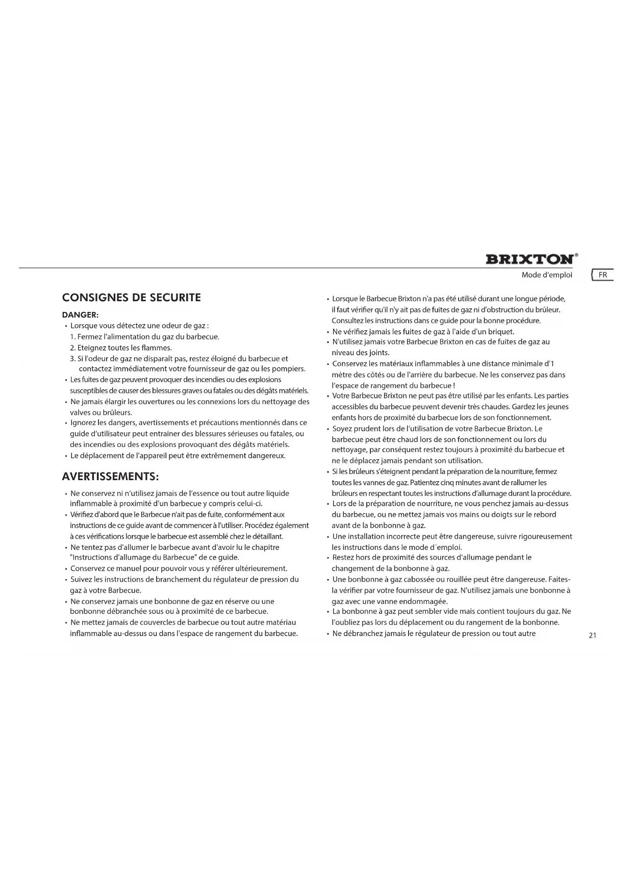 - N'utilisez jamais votre Barbecue Brixton en cas de fuites de gaz au niveau des joints.