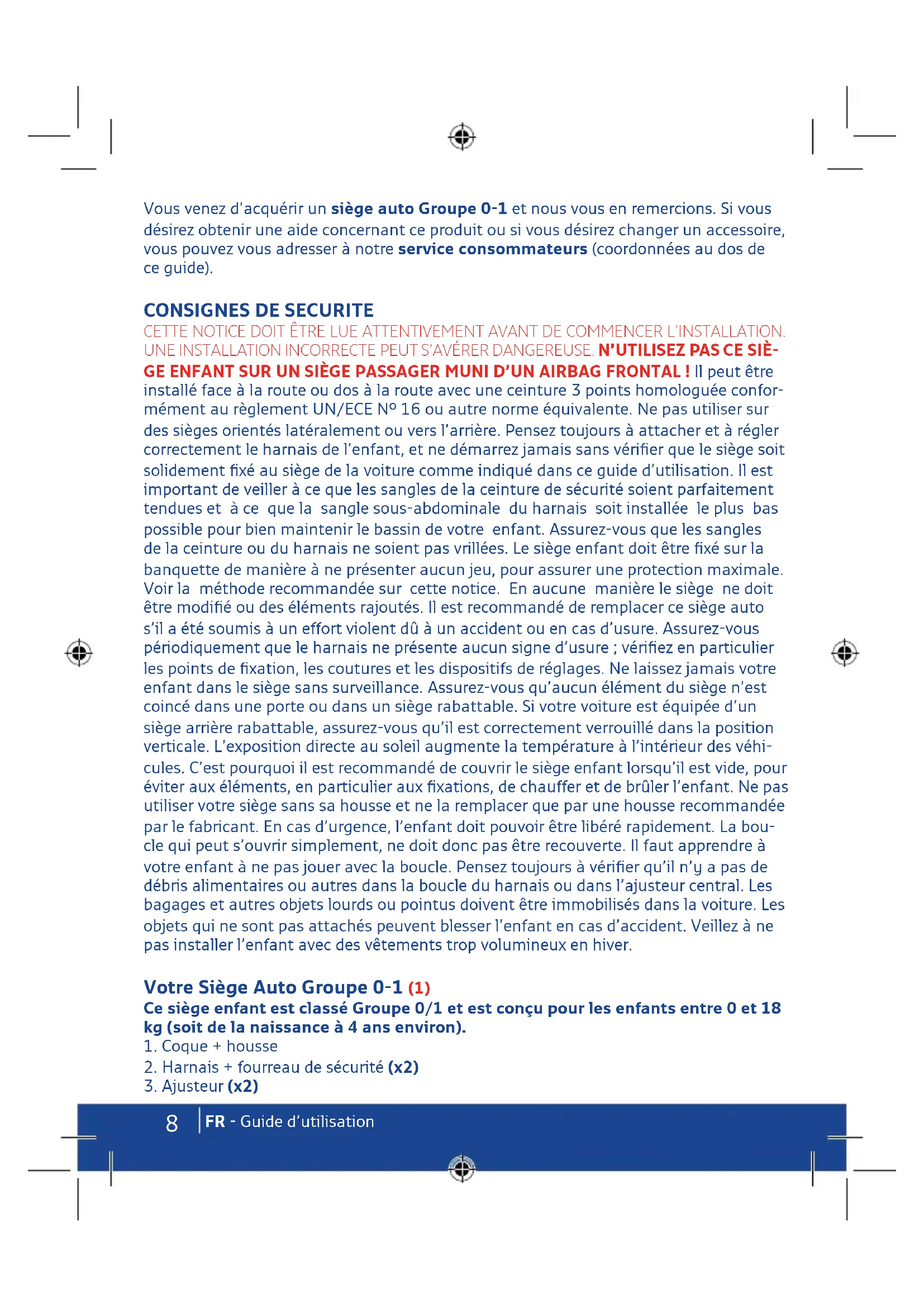 FR - Guide d’utilisation Vous venez d’acquérir un siège auto Groupe 0-1 et nous vous en remercions. Si vous désirez obtenir une aide concernant ce produit ou si vous désirez changer un accessoire, vous pouvez vous adresser à notre service consommateurs (coordonnées au dos de ce guide).