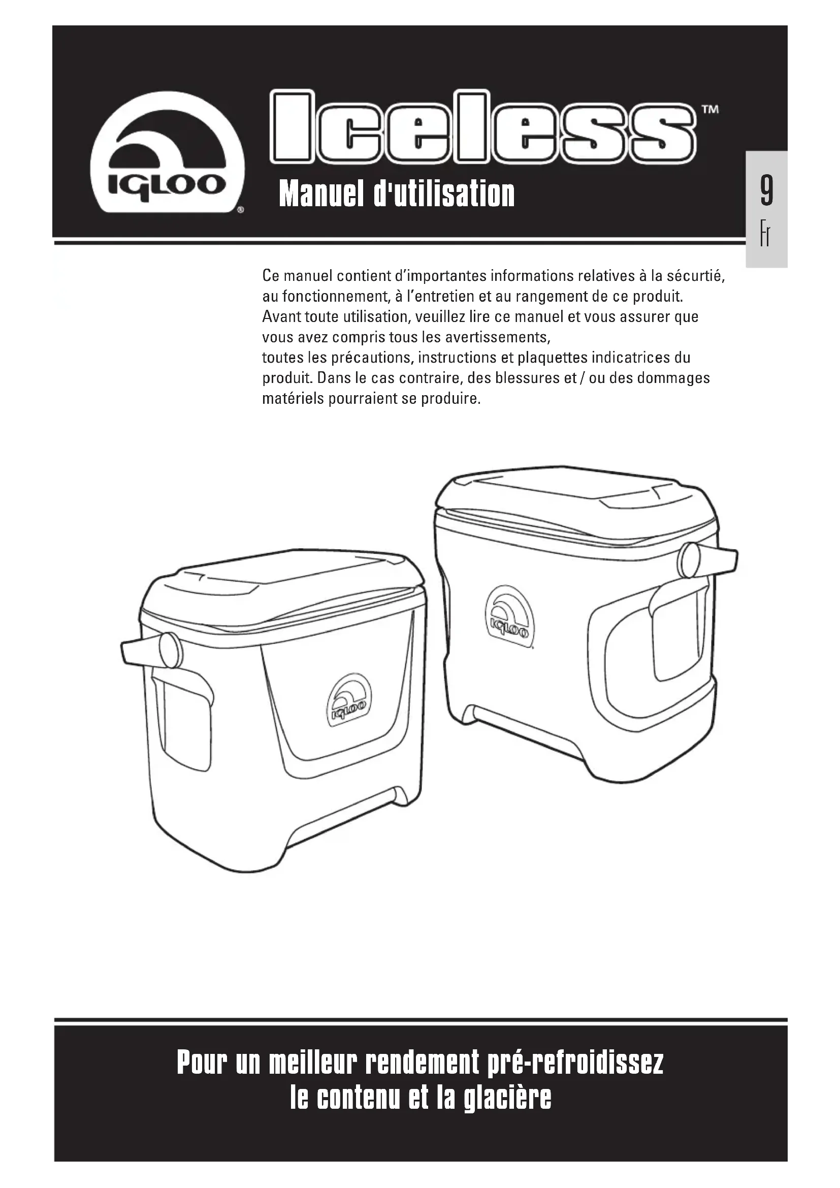 Conserver ces instructions pour référence future. Lors de l’utilisation d’appareils électriques, afin de réduire le risque d’incendie, de choc électrique et /ou de blessures aux personnes, de simples précautions de sécurité doivent être respectées parmi lesquelles :1. Ne pas placer le fil d’alimentation, la prise ou la glacière Iceless dans l’eau ou tout autre liquide afin d’éviter tout choc électrique. 2. Ne pas exposer la glacière à la pluie. Un choc électrique peut se produire si l’appareil est utilisé sur des surfaces mouillées. Ne pas manipuler la prise avec les mains mouillées. 3. Une surveillance attentive est nécessaire lorsque tout appareil est utilisé par des enfants ou auprès d’eux. 4. Débrancher la glacière Iceless lorsqu’elle n’est pas utilisée et avant de la nettoyer.5. N’employer cet appareil que pour l’utilisation décrite dans le présent manuel. N’utiliser que les accessoires et les équipements recommandés par Igloo.6. Ne pas faire fonctionner un appareil dont le fil d’alimentation ou dont la prise est abîmé(e), après qu’il ait présenté un dysfonctionnement ou qu’il ait été endommagé de quelque manière que ce soit. Rapporter l’appareil à un service agréé pour examen, réparation ou réglage. 7. Ne pas retirer les caches d’entretien afin de réduire le risque d’incendie ou de choc électrique. La glacière Iceless doit être réparée uniquement par du personnel agréé.