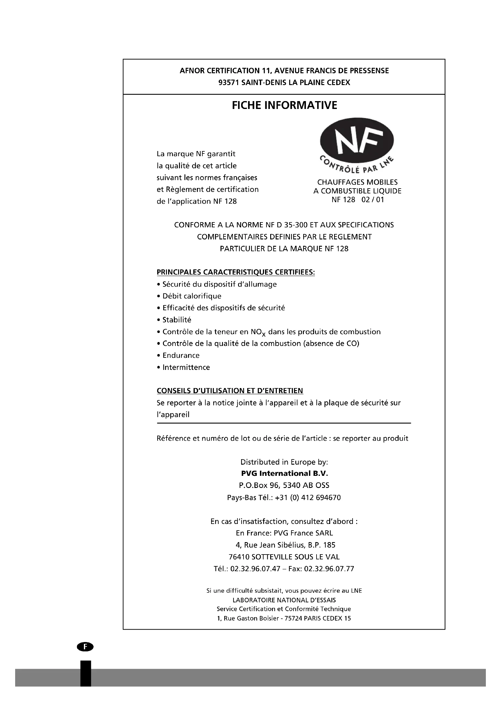 93571 SAINT-DENIS LA PLAINE CEDEXChère Madame, Cher Monsieur, Nous vous remercions de la confiance que vous avez bien voulu témoigner à notre marque en choisissant un appareil mobile de chauffage à combustible liquide. Vous venez d'acquérir un produit de qualité, qui vous donnera entière satisfaction durant de très nombreuses années. A condition, bien sûr, de respecter les consignes d'utilisation. C'est pourquoi nous vous invitons vivement à consulter ce manuel afin d'assurer à votre appareil une durée de vie optimale. Les produits sont garantis contre tout vice de fabrication ou de conception (hors consommables) pendant une durée de 2 ans à compter de leur date d'achat. Nous vous souhaitons beaucoup de chaleur et de confort avec votre appareil. Bien cordialement, PVG International b.v. Service-Consommateurs 1 LISEZ PRÉALABLEMENT LE MANUEL D'UTILISATION. 2 EN CAS DE DOUTE, CONTACTEZ VOTRE REVENDEUR. 3 POUR LIRE, DÉPLIEZ LA DERNIÈRE PAGE. E E E E E E E E E E E E E3 POUR LIRE, DÉPLIEZ LA DERNIÈRE PAGE. E E E E E E E E E E E E E