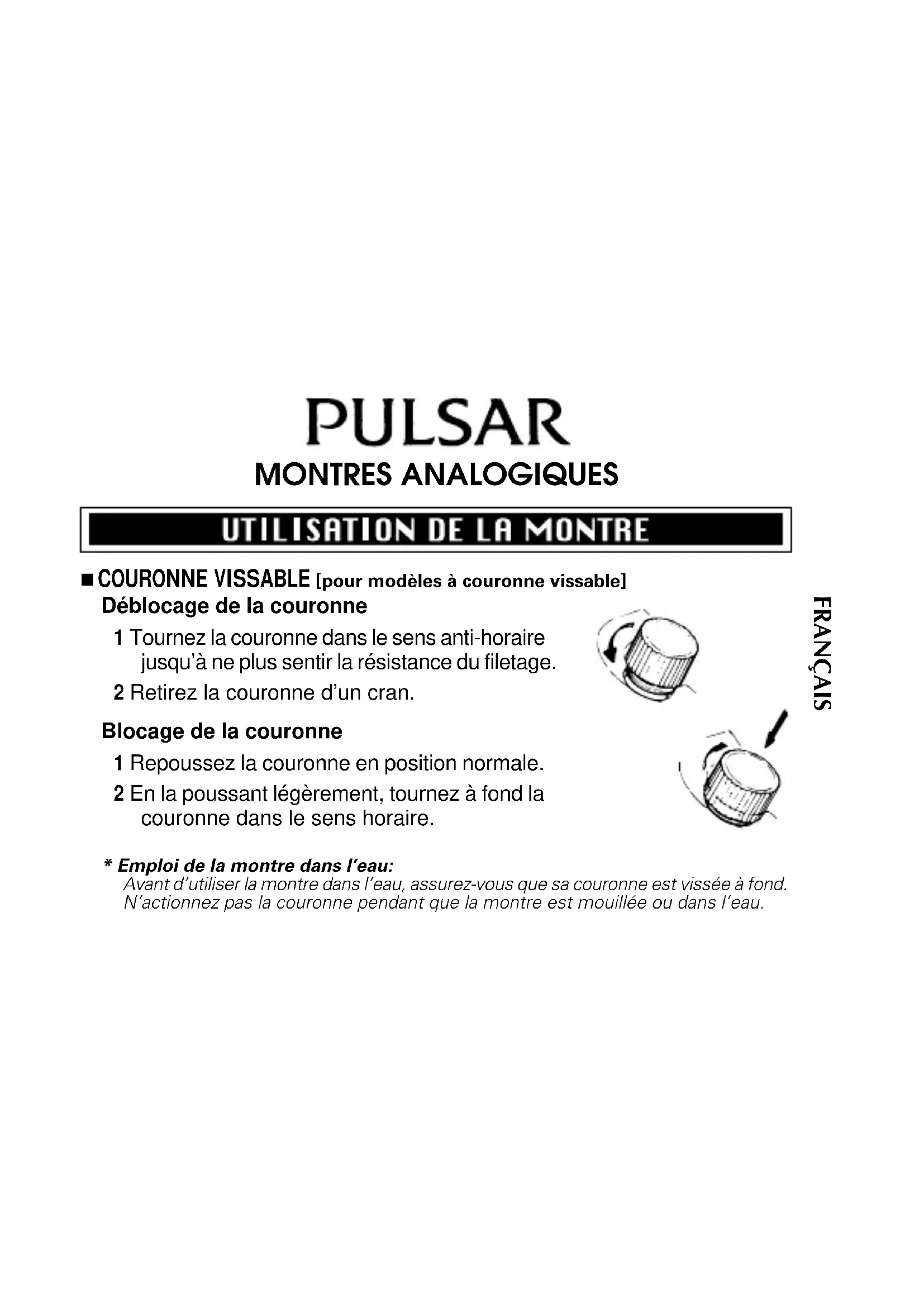bar WR pour la natation, le yachting et pour prendre une douche. ● Etanchéité (5 bars)* Si la mention “WATER RESISTANT” ne figure pas sur le dos du boîtier, la montre n’est pas étanche et l’on veillera à ne pas la mouiller car l’eau endommagerait son mouvement. Si la montre a été mouillée, il est conseillé de la faire vérifier par un CONCESSIONNAIRE ou un CENTRE DE SERVICE PULSAR AUTORISE. ● Etanchéité (3 bars) Si la mention “WATER RESISTANT” figure sur le dos du boîtier, la montre a été conçue et fabriquée pour résister jusqu’à 3 bars, comme lors des contacts accidentels avec de l’eau, en cas d’éclaboussures ou de pluie, mais elle ne convient ni pour la natation ni pour la plongée.Français