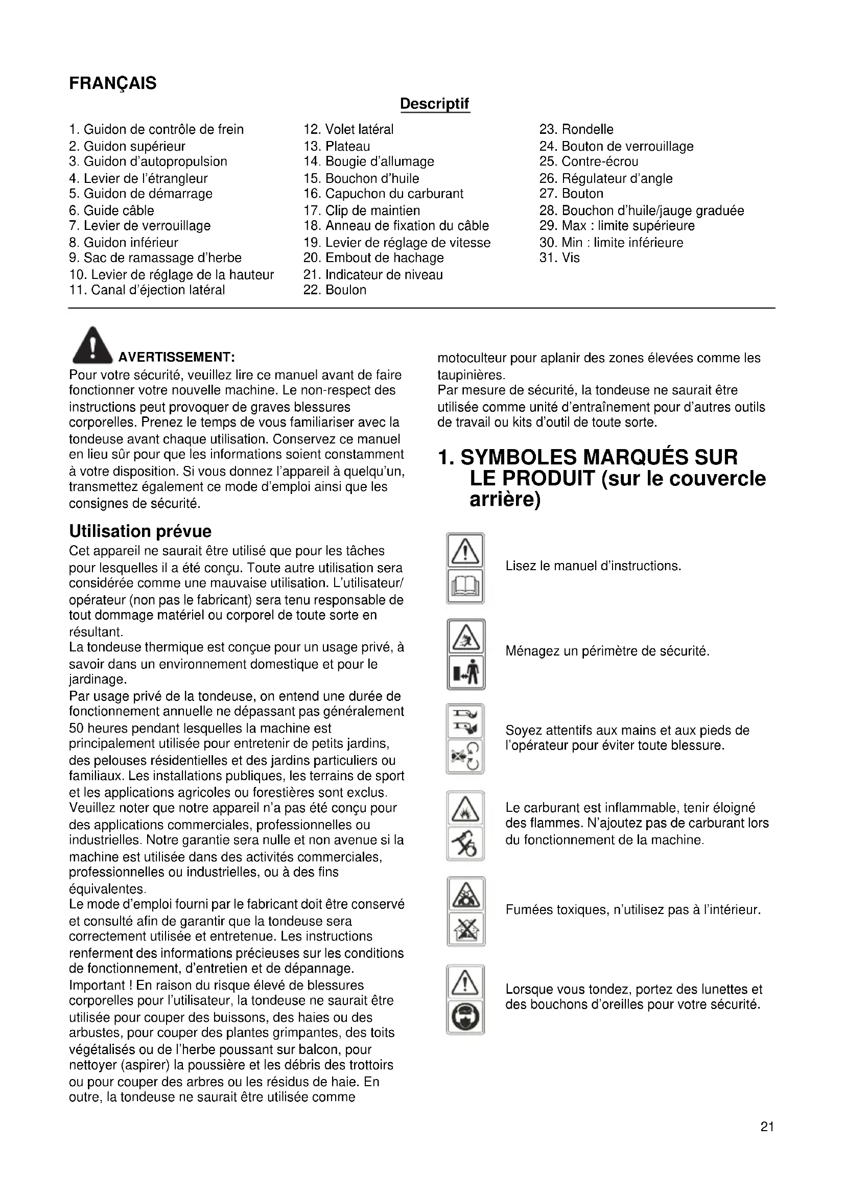 Lisez le manuel d’instructions. Ménagez un périmètre de sécurité. Soyez attentifs aux mains et aux pieds de l’opérateur pour éviter toute blessure. Le carburant est inflammable, tenir éloigné des flammes. N’ajoutez pas de carburant lors du fonctionnement de la machine. Fumées toxiques, n’utilisez pas à l’intérieur. Lorsque vous tondez, portez des lunettes et des bouchons d’oreilles pour votre sécurité.22