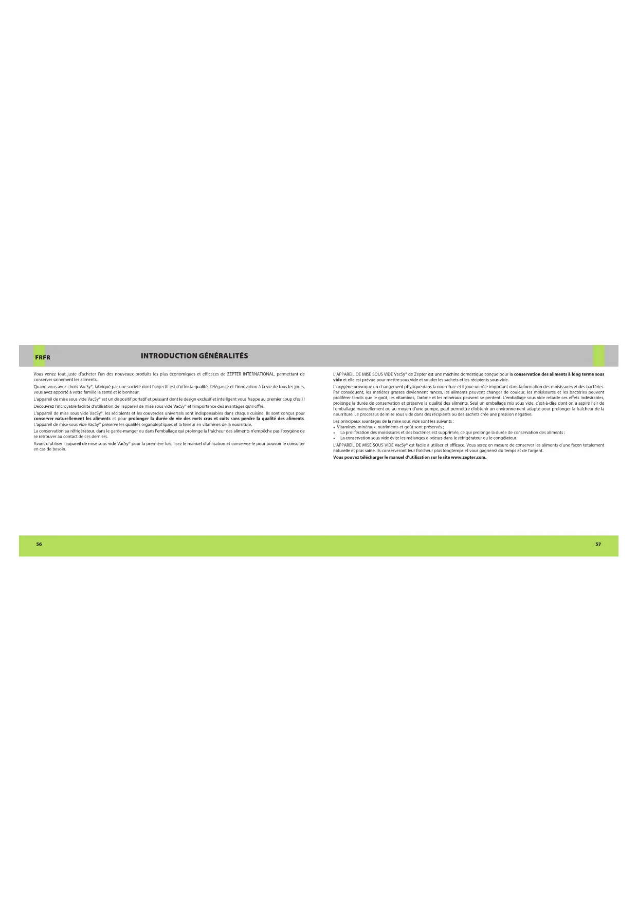 - La conservation sous vide évite les mélanges d’odeurs dans le réfrigérateur ou le congélateur. L’APPAREIL DE MISE SOUS VIDE VacSy® est facile à utiliser et efficace. Vous serez en mesure de conserver les aliments d’une façon totalement naturelle et plus saine. Ils conserveront leur fraîcheur plus longtemps et vous gagnerez du temps et de l'argent. Vous pouvez télécharger le manuel d’utilisation sur le site www.zepter.com.5958 FR FR