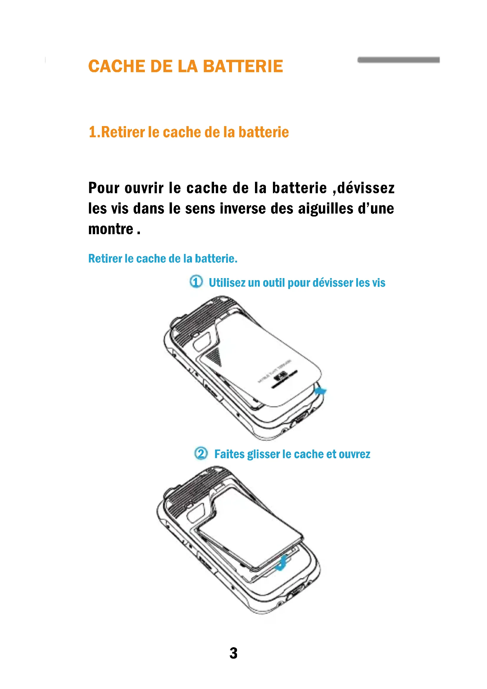 Pour ouvrir le cache de la batterie ,dévissez les vis dans le sens inverse des aiguilles d’une montre . Retirer le cache de la batterie. 1 Utilisez un outil pour dévisser les vis 2 Faites glisser le cache et ouvrez2.Soulever le cache