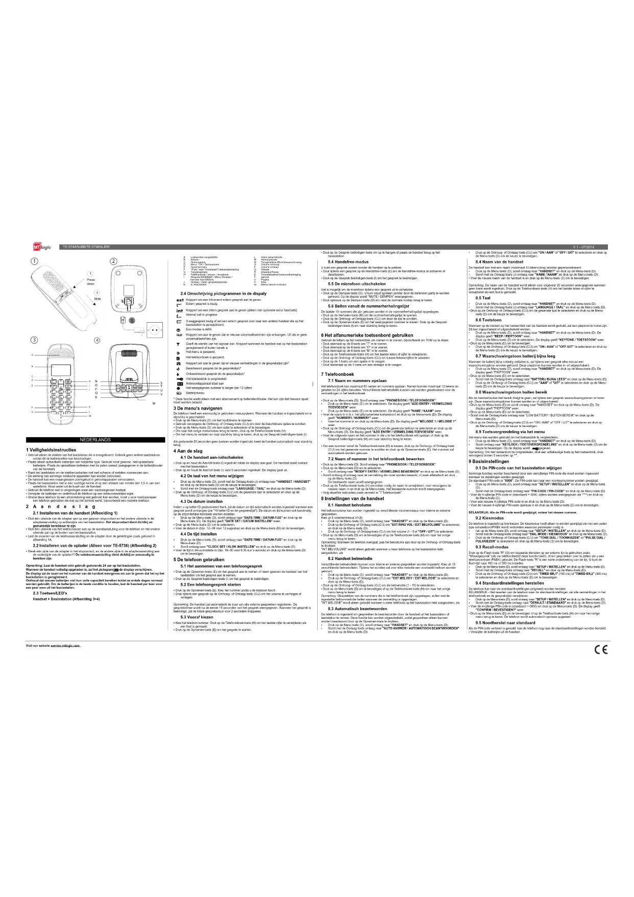 - dans les 5 secondes. Clignote pour signaler un appel entrant externe Appel externe en cours Clignote pour indiquer un appel interne entrant (uniquement avec des combinés supplémentaires en option) Appel interne en cours Conférence à 3 en cours ou transfert d'un appel externe vers un autre combiné mémorisé sur la base. L'Eco mode est en MARCHE Clignote pour signaler de nouveaux messages vocaux reçus. Arrêté lorsqu'aucun message vocal. Signale la puissance de signal. Clignote lorsque le combiné n'est pas mémorisé sur la base ou lorsqu'il est hors de portée. Le menu est ouvert Le répertoire est ouvert Clignote pour signaler la liste de nouveaux appels entrants reçus'. Appel répondu (lors de la visualisation de la liste des appels)* Appel manqué (lors de la visualisation de la liste des appels)* Le pavé est bloqué Le répondeur est allumé Le numéro affiché est plus long que 12 chiffres. Niveau de puissance de la batterie FRANÇAIS A écouteurBécranC Touche HautD Touche Menu/OK/SourdineE Touche ‘Parler’F */Numérotation d’impulsion à tonalité/Verrouillage de toucheG Touche RappelH Touche Répertoire/supprimer/retourI Touche Fin d’appel/Quitter Menu/Récepteur Marche/ArrêtJ Touche Bas/Accès liste d’appelsK Touche #/PauseL Touche appel interneM Touche de rappelN Saut arrière/Alerte messageO Volume HautP Volume BasQ Supprimer RLecture/Pause S Saut avant/retard de réponseT Marche/ArrêtU PageVArrêtW Indicateur de nouveau messageVisitez notre site web service.mtlogic.com