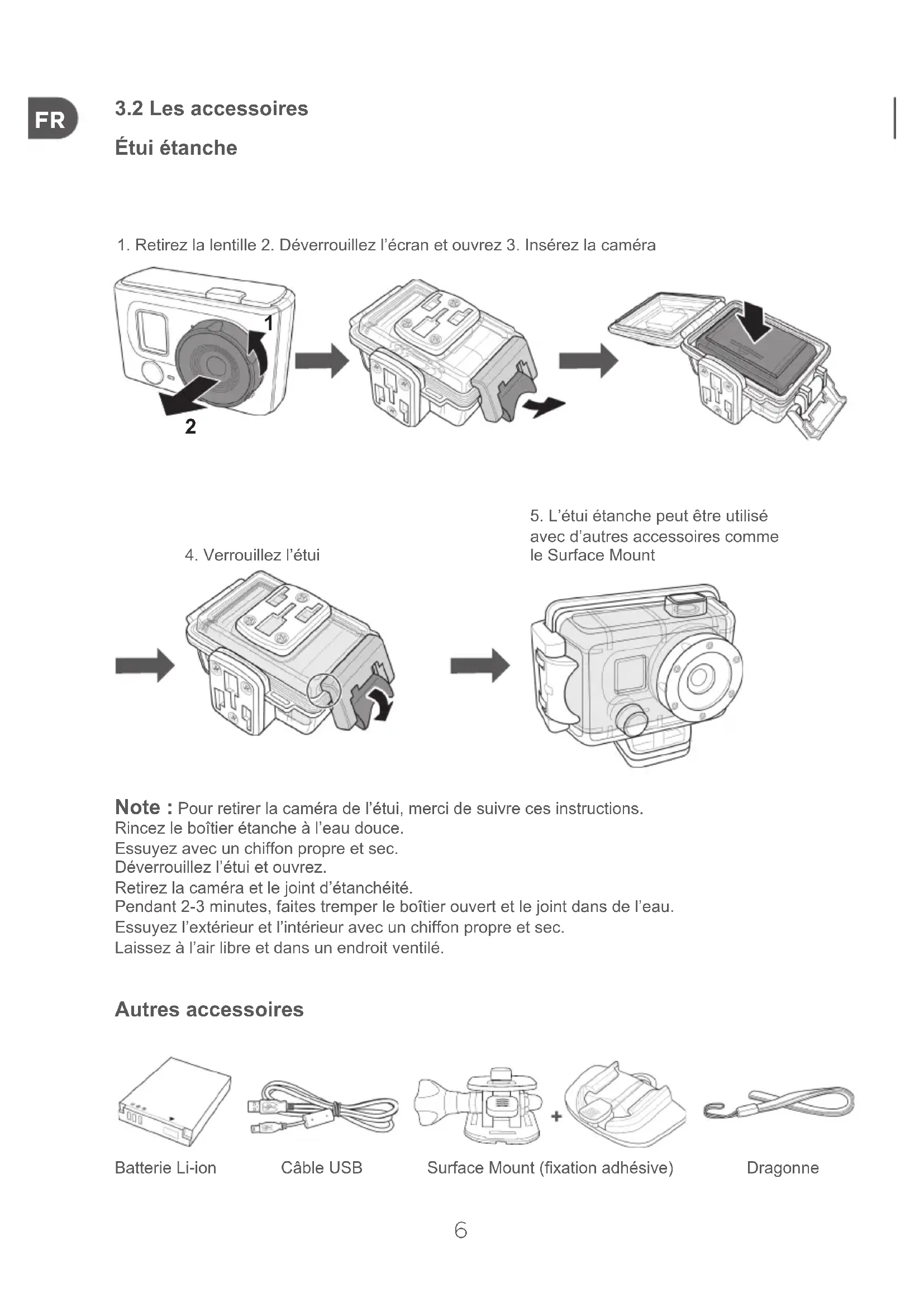 Étui étanche Note : Pour retirer la caméra de l’étui, merci de suivre ces instructions. Rincez le boîtier étanche à l’eau douce. Essuyez avec un chiffon propre et sec. Déverrouillez l’étui et ouvrez. Retirez la caméra et le joint d’étanchéité. Pendant 2-3 minutes, faites tremper le boîtier ouvert et le joint dans de l’eau. Essuyez l’extérieur et l’intérieur avec un chiffon propre et sec. Laissez à l’air libre et dans un endroit ventilé. Autres accessoires Batterie Li-ion Câble USB Surface Mount (xation adhésive) Dragonne