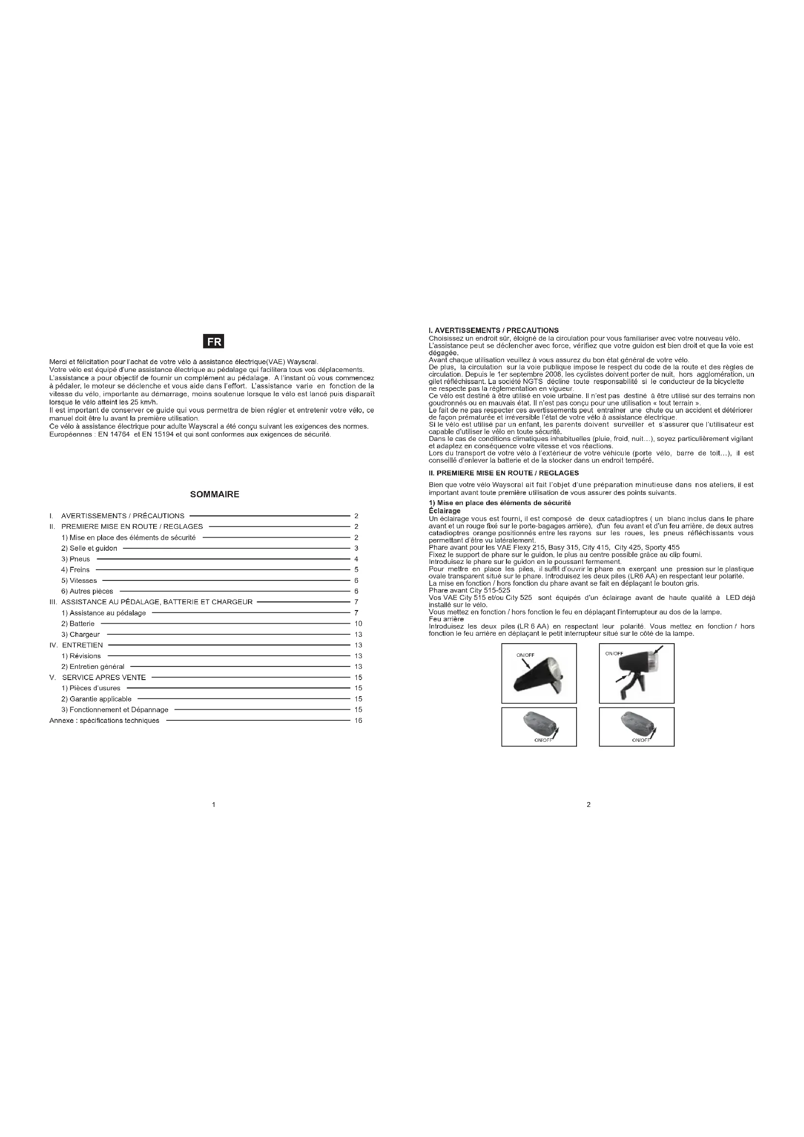 SOMMAIRE Merci et félicitation pour l’achat de votre vélo à assistance électrique(VAE) Wayscral. Votre vélo est équipé d’une assistance électrique au pédalage qui facilitera tous vos déplacements. L’assistance a pour objectif de fournir un complément au pédalage. A l’instant où vous commencez à pédaler, le moteur se déclenche et vous aide dans l’effort. L’assistance varie en fonction de la vitesse du vélo, importante au démarrage, moins soutenue lorsque le vélo est lancé puis disparaît lorsque le vélo atteint les 25 km/h. Il est important de conserver ce guide qui vous permettra de bien régler et entretenir votre vélo, ce manuel doit être lu avant la première utilisation. Ce vélo à assistance électrique pour adulte Wayscral a été conçu suivant les exigences des normes. Européennes : EN 14764 et EN 15194 et qui sont conformes aux exigences de sécurité.