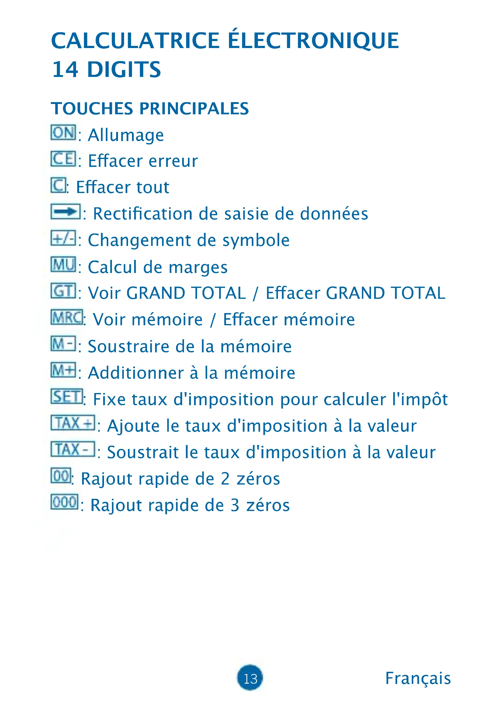 . F : Point décimal ottant. . 4.2.0 : Nombre de positions décimales . ADD2 : Indique que le nombre de décimales se situe automatiquement à 2 (par exemple, si on appuie sur 8, la valeur est 0,08 mais si on appuie sur “.” cette position est la base). Cette caractéristique n'est eective que pour addition et soustraction. DESCRIPTION DE L'ÉCRAN LCD : GRAND TOTAL: indique que la mémoire GT est active. MEMORY: Symbole Mémoire indépendante, indique que la mémoire indépendante est active. - : Symbole négatif. ERROR: Indique que le nombre maximum de digits sur l'écran a été dépassé, lorsque l'écran ache "ERROR", appuyer pour eacer l'erreur .15 EXEMPLE DE CALCUL : Calcul de marges ÉCRANOPÉRATIONEXEMPLE