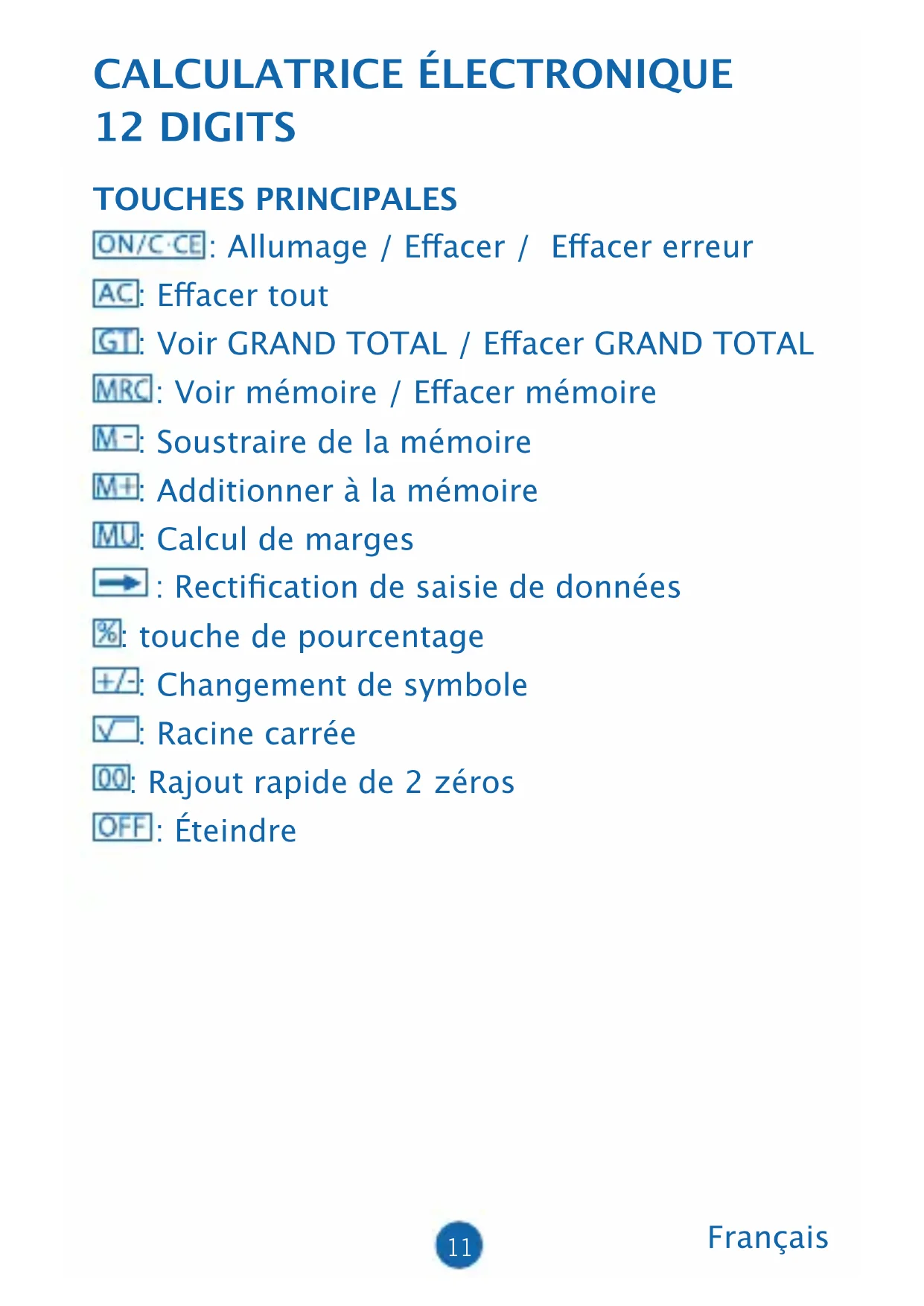 . F : Point décimal ottant. . 5/4 : Arrondit les décimales à deux postes. . : Arrondit à la baisse les décimales à deux. DESCRIPTION DE L’ÉCRAN LCD : GT : Symbole GRAND TOTAL, indique que la mémoire GT est active. M : Symbole Mémoire indépendante, indique que la mémoire indépendante est active. - : Symbole négatif. E : Symbole d’erreur, lorsque l’écran ache “E”, on peut appuyer pour eacer l’erreur