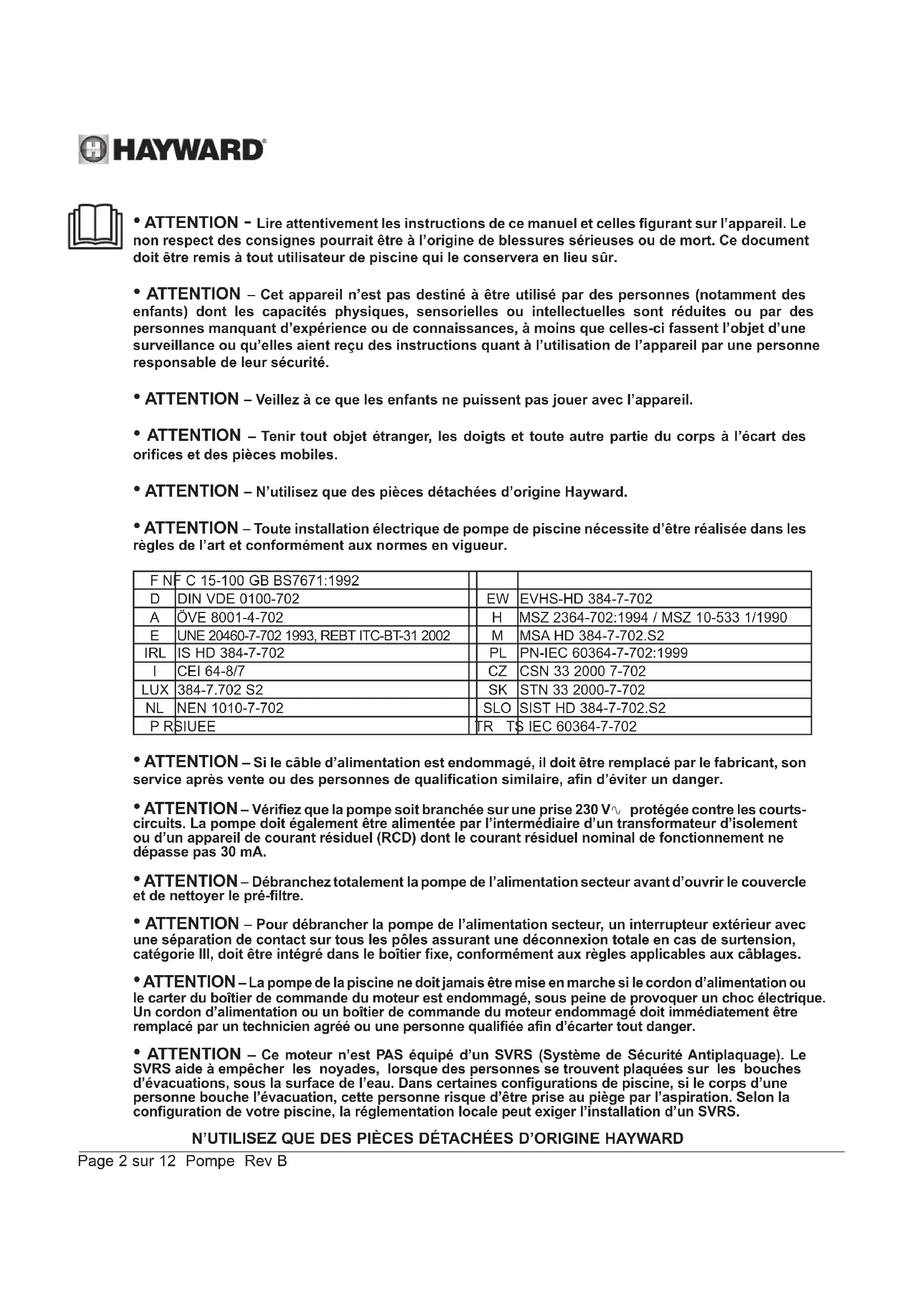- ATTENTION – Ce moteur n’est PAS équipé d’un SVRS (Système de Sécurité Antiplaquage). Le SVRS aide à empêcher les noyades, lorsque des personnes se trouvent plaquées sur les bouches d’évacuations, sous la surface de l’eau. Dans certaines configurations de piscine, si le corps d’une personne bouche l’évacuation, cette personne risque d’être prise au piège par l’aspiration. Selon la configuration de votre piscine, la réglementation locale peut exiger l’installation d’un SVRS.N’UTILISEZ QUE DES PIÈCES DÉTACHÉES D’ORIGINE HAYWARD Page 3 sur 12 Pompe Rev B