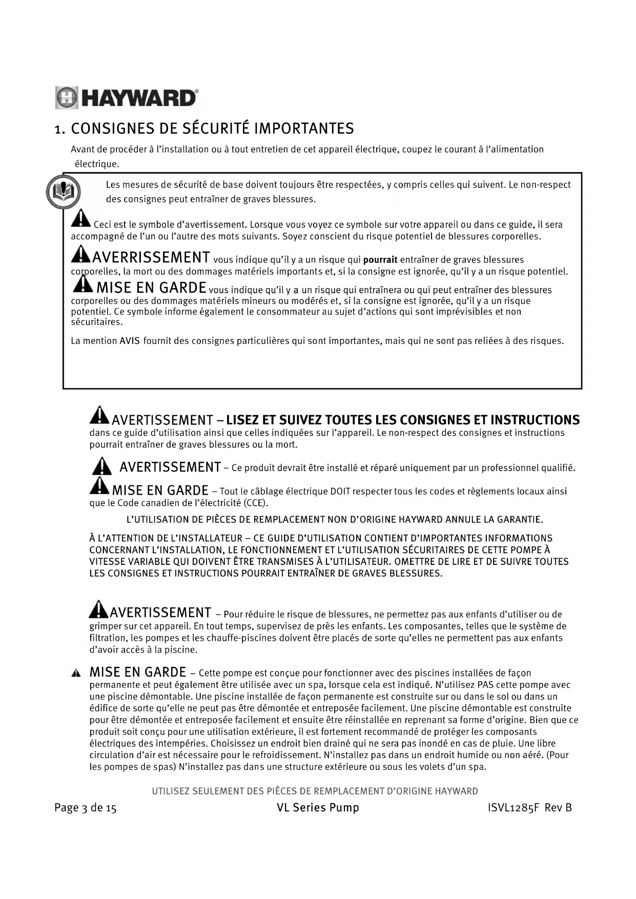 - 11. Enregistrement du produit UTILISEZ SEULEMENT DES PIÈCES DE REMPLACEMENT D’ORIGINE HAYWARD Page 3 de 15 VL Series Pump ISVL1285F Rev B Les mesures de sécurité de base doivent toujours être respectées, y compris celles qui suivent. Le non-respect des consignes peut entraîner de graves blessures. Ceci est le symbole d’avertissement. Lorsque vous voyez ce symbole sur votre appareil ou dans ce guide, il sera accompagné de l’un ou l’autre des mots suivants. Soyez conscient du risque potentiel de blessures corporelles. AVERRISSEMENT vous indique qu’il y a un risque qui pourrait entraîner de graves blessures corporelles, la mort ou des dommages matériels importants et, si la consigne est ignorée, qu’il y a un risque potentiel. p. 15