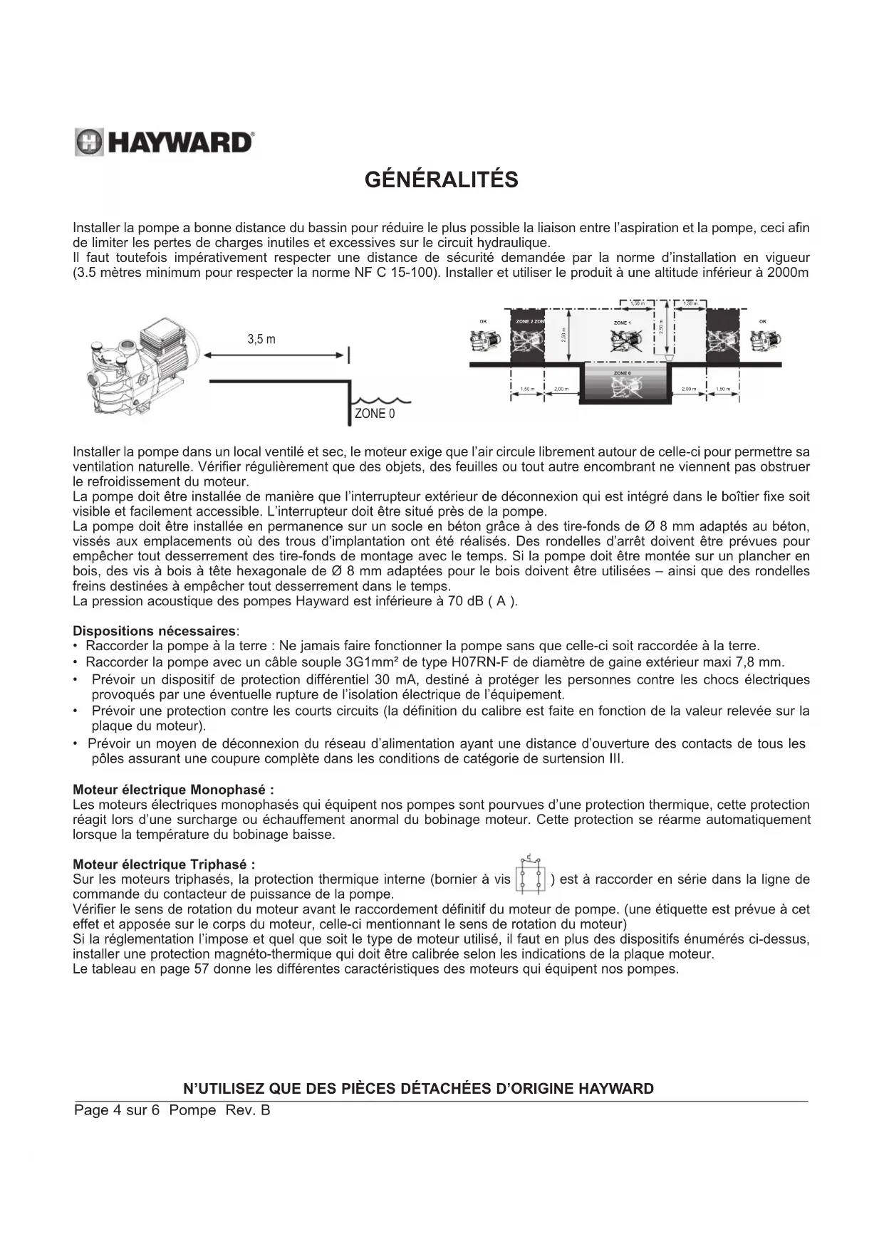 ) est à raccorder en série dans la ligne de commande du contacteur de puissance de la pompe. Vérifier le sens de rotation du moteur avant le raccordement définitif du moteur de pompe. (une étiquette est prévue à cet effet et apposée sur le corps du moteur, celle-ci mentionnant le sens de rotation du moteur) Si la réglementation l’impose et quel que soit le type de moteur utilisé, il faut en plus des dispositifs énumérés ci-dessus, installer une protection magnéto-thermique qui doit être calibrée selon les indications de la plaque moteur. Le tableau en page 57 donne les différentes caractéristiques des moteurs qui équipent nos pompes.N’UTILISEZ QUE DES PIÈCES DÉTACHÉES D’ORIGINE HAYWARD Page 5 sur 6 Pompe Rev. B Raccordement électrique : S’assurer que la tension d’alimentation exigée par le moteur correspond à celle du réseau de distribution et que la section et longueur du câble d’alimentation sont adaptées à la puissance et a l’intensité de la pompe. L’ensemble des raccordements électriques de la pompe ainsi que l’éventuel changement du câble d’alimentation doivent être réalisés par un professionnel qualifié afin d’éviter tout danger. Pour réaliser ces raccordements électriques, se reporter au schéma qui figure sous le couvercle de la plaque a bornes du moteur. Bien vérifier le serrage et l’étanchéité des connexions électriques avant la mise sous tension. Le pré-câblage éventuel qui équipe certaines de nos pompes doit être retiré lors du raccordement définitif de la pompe à l’alimentation électrique. En effet ce pré équipement n’est utilisé que pour les tests en usine pendant les phases de fabrication. INSTALLATION Installer la pompe de la piscine en limitant au maximum les pertes de charges tout en respectant les conditions d’éloignement, 3,5 m minimum entre celle-ci et la piscine comme précisé dans la norme d’installation NF C 15-100. La conduite d’aspiration doit être installée avec une faible pente ascendante vers l’axe de la pompe. S’assurer que les raccords soient bien serrés et étanches. Toutefois, éviter de bloquer ces tuyauteries d’une façon exagérée. Pour les matières plastiques, assurer l’étanchéité avec du Téflon uniquement. Le tuyau d’aspiration aura un diamètre plus grand ou au moins égal a celui du refoulement. Éviter des emplacements non ventilés ou humides. Le moteur exige que l’air de refroidissement puisse circuler librement. IMPORTANT : Vérifier le sens de rotation avant le raccordement définitif du moteur. INSTRUCTIONS DE DÉMARRAGE ET D’AMORÇAGE : Remplir d’eau le corps du pré-filtre jusqu’au niveau du tuyau d’aspiration. Ne jamais faire fonctionner la pompe sans eau, cette eau étant nécessaire au refroidissement et a la lubrification de l’obturateur mécanique. Ouvrir toutes les vannes des conduites d’aspiration et de refoulement, de même que la purge d’air du filtre s’il en est pourvu. (Toute présence d’air dans les conduites d’aspiration devra être éliminée). Démarrer le groupe et attendre un temps raisonnable pour l’amorçage. Cinq minutes n’est pas un laps de temps exagéré pour amorcer (cet amorçage dépend de la hauteur d’aspiration et de la longueur du tuyau d’aspiration). Si la pompe ne démarre pas ou ne s’amorce pas voir le guide de recherche des pannes. ENTRETIEN 1. Débranchez totalement la pompe de l’alimentation secteur avant d’ouvrir le couvercle et de nettoyer le pré-filtre. Nettoyer le panier du pré-filtre régulièrement, ne pas frapper sur le panier pour le nettoyer. Vérifier le joint du couvercle du pré-filtre et le remplacer si nécessaire.