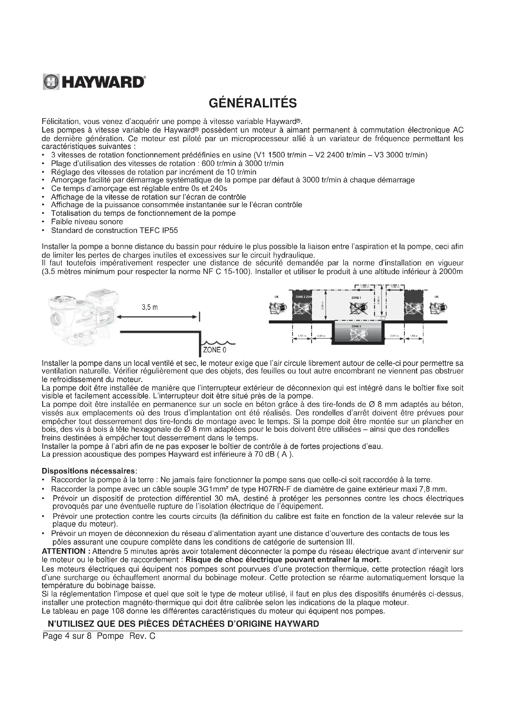 3,5 m ZONE 0 Installer la pompe dans un local ventilé et sec, le moteur exige que l’air circule librement autour de celle-ci pour permettre sa ventilation naturelle. Vérifier régulièrement que des objets, des feuilles ou tout autre encombrant ne viennent pas obstruer le refroidissement du moteur. La pompe doit être installée de manière que l’interrupteur extérieur de déconnexion qui est intégré dans le boîtier fixe soit visible et facilement accessible. L’interrupteur doit être situé près de la pompe. La pompe doit être installée en permanence sur un socle en béton grâce à des tire-fonds de Ø 8 mm adaptés au béton, vissés aux emplacements où des trous d’implantation ont été réalisés. Des rondelles d’arrêt doivent être prévues pour empêcher tout desserrement des tire-fonds de montage avec le temps. Si la pompe doit être montée sur un plancher en ERLVGHVYLVjERLVjWrWHKH[DJRQDOHGHPPDGDSWpHVSRXUOHERLVGRLYHQWrWUHXWLOLVpHV±DLQVLTXHGHVURQGHOOHV freins destinées à empêcher tout desserrement dans le temps. ,QVWDOOHUODSRPSHjO¶DEULDILQGHQHSDVH[SRVHUOHERvWLHUGHFRQWU{OHjGHIRUWHVSURMHFWLRQVG¶HDX /DSUHVVLRQDFRXVWLTXHGHVSRPSHV+D\ZDUGHVWLQIpULHXUHjG%$ 'LVSRVLWLRQVQpFHVVDLUHV: 5DFFRUGHUODSRPSHjODWHUUH1HMDPDLVIDLUHIRQFWLRQQHUODSRPSHVDQVTXHFHOOHFLVRLWUDFFRUGpHjODWHUUH 5DFFRUGHUODSRPSHDYHFXQFkEOHVRXSOH*PPðGHW\SH+51)GHGLDPqWUHGHJDLQHH[WpULHXUPD[LPP 3UpYRLU XQ GLVSRVLWLI GH SURWHFWLRQ GLIIpUHQWLHOP$GHVWLQpjSURWpJHUOHVSHUVRQQHVFRQWUHOHVFKRFVpOHFWULTXHV provoqués par une éventuelle rupture de l’isolation électrique de l’équipement. 3UpYRLUXQHSURWHFWLRQFRQWUHOHVFRXUWVFLUFXLWVODGpILQLWLRQGXFDOLEUHHVWIDLWHHQIRQFWLRQGHODYDOHXUUHOHYpHVXUOD plaque du moteur). 3UpYRLUXQPR\HQGHGpFRQQH[LRQGXUpVHDXG¶DOLPHQWDWLRQD\DQWXQHGLVWDQFHG¶RXYHUWXUHGHVFRQWDFWVGHWRXVOHV S{OHVDVVXUDQWXQHFRXSXUHFRPSOqWHGDQVOHVFRQGLWLRQVGHFDWpJRULHGHVXUWHQVLRQ,,, ATTENTION : Attendre 5 minutes après avoir totalement déconnecter la pompe du réseau électrique avant d’intervenir sur le moteur ou le boîtier de raccordement : 5LVTXHGHFKRFpOHFWULTXHSRXYDQWHQWUDvQHUODPRUW. Les moteurs électriques qui équipent nos pompes sont pourvues d’une protection thermique, cette protection réagit lors d’une surcharge ou échauffement anormal du bobinage moteur. Cette protection se réarme automatiquement lorsque la température du bobinage baisse. Si la réglementation l’impose et quel que soit le type de moteur utilisé, il faut en plus des dispositifs énumérés ci-dessus, installer une protection magnéto-thermique qui doit être calibrée selon les indications de la plaque moteur. Le tableau en page 108 donne les différentes caractéristiques du moteur qui équipent nos pompes.N’UTILISEZ QUE DES PIÈCES DÉTACHÉES D’ORIGINE HAYWARD Page 5 sur 8 Pompe Rev. C 5DFFRUGHPHQWpOHFWULTXH S’assurer que la tension d’alimentation exigée par le moteur correspond à celle du réseau de distribution et que la section et longueur du câble d’alimentation sont adaptées à la puissance et a l’intensité de la pompe. L’ensemble des raccordements électriques de la pompe ainsi que l’éventuel changement du câble d’alimentation doivent être réalisés par un professionnel qualifié afin d’éviter tout danger. Pour réaliser ces raccordements électriques, respecter le repérage inscrits en dessous des bornes de raccordement. Bien vérifier le serrage et l’étanchéité des connexions électriques avant la mise sous tension. Bien respecter le passage du câble par l’orifice et ferrite prévu à cet effet; le presse étoupe assurant l’étanchéité autour du câble, la ferrite constituant un filtre pour les perturbations électromagnétiques. Le pré-câblage éventuel qui équipe certaines de nos pompes doit être retiré lors du raccordement définitif de la pompe à l’alimentation électrique. En effet ce pré équipement n’est utilisé que pour les tests en usine pendant les phases de fabrication. INSTALLATION Installer la pompe de la piscine en limitant au maximum les pertes de charges tout en respectant les conditions d’éloignement, 3,5 m minimum entre celle-ci et la piscine comme précisé dans la norme d’installation NF C 15-100. La conduite d’aspiration doit être installée avec une faible pente ascendante vers l’axe de la pompe. S’assurer que les raccords soient bien serrés HW pWDQFKHV 7RXWHIRLV pYLWHU GH EORTXHU FHV WX\DXWHULHV G¶XQH IDoRQ H[DJpUpH 3RXU OHV PDWLqUHV SODVWLTXHV DVVXUHU l’étanchéité avec du Téflon uniquement. Le tuyau d’aspiration aura un diamètre plus grand ou au moins égal a celui du refoulement. Éviter des emplacements non ventilés ou humides. Le moteur exige que l’air de refroidissement puisse circuler librement. ,QVWDOOHUODSRPSHjO¶DEULDILQGHQHSDVH[SRVHUOHERvWLHUGHFRQWU{OHjGHIRUWHVSURMHFWLRQVG¶HDX IMPORTANT : Vérifier le sens de rotation avant le raccordement définitif du moteur. INSTRUCTIONS DE DÉMARRAGE ET D’AMORÇAGE : Remplir d’eau le corps du pré-filtre jusqu’au niveau du tuyau d’aspiration. Ne jamais faire fonctionner la pompe sans eau, cette eau étant nécessaire au refroidissement et a la lubrification de l’obturateur mécanique. Ouvrir toutes les vannes des conduites d’aspiration et de refoulement, de même TXHODSXUJHG¶DLUGXILOWUHV¶LOHQHVWSRXUYX7RXWHSUpVHQFHG¶DLUGDQVOHVFRQGXLWHVG¶DVSLUDWLRQGHYUDrWUHpOLPLQpH 'pPDUUHUOHJURXSHHWDWWHQGUHXQWHPSVUDLVRQQDEOHSRXUO¶DPRUoDJH&LQTPLQXWHVQ¶HVWSDVXQODSVGHWHPSVH[DJpUp SRXUDPRUFHUFHWDPRUoDJHGpSHQGGHODKDXWHXUG¶DVSLUDWLRQHWGHODORQJXHXUGXWX\DXG¶DVSLUDWLRQ6LODSRPSHQH démarre pas ou ne s’amorce pas voir le guide de recherche des pannes. UTILISATION 3UpVHQWDWLRQGHO¶LQWHUIDFHXWLOLVDWHXU /¶LQWHUIDFHXWLOLVDWHXUGHVSRPSHVjYLWHVVHYDULDEOHSHUPHWO¶DFFqVDX[UpJODJHVHWDX[FRQWU{OHVGHVYLWHVVHV/HV boutons haut et bas vous serviront à ajuster les vitesses de fonctionnement ainsi que les différents paramètres de réglage. L’interface utilisateur permet égalemen
