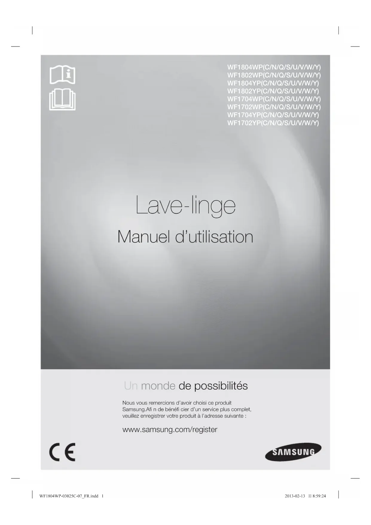 Lave-linge Manuel d’utilisation Un monde de possibilités Nous vous remercions d’avoir choisi ce produit Samsung.Afi n de bénéfi cier d’un service plus complet, veuillez enregistrer votre produit à l’adresse suivante : www.samsung.com/register WF1804WP(C/N/Q/S/U/V/W/Y) WF1802WP(C/N/Q/S/U/V/W/Y) WF1804YP(C/N/Q/S/U/V/W/Y) WF1802YP(C/N/Q/S/U/V/W/Y) WF1704WP(C/N/Q/S/U/V/W/Y) WF1702WP(C/N/Q/S/U/V/W/Y) WF1704YP(C/N/Q/S/U/V/W/Y) WF1702YP(C/N/Q/S/U/V/W/Y) WF1804WP-03025C-07_FR.indd 1WF1804WP-03025C-07_FR.indd 1 2013-02-13 8:59:242013-02-13 8:59:242_ Caractéristiques de votre nouveau lave-linge samsung Caractéristiques de votre nouveau lave-linge samsung Avec ce nouveau lave-linge, faire une lessive prend un tout autre sens. Capacité XXL, économie d’énergie...Le lave-linge Samsung possède toutes les caractéristiques nécessaires pour transformer une tâche désagréable en un vrai moment de plaisir.