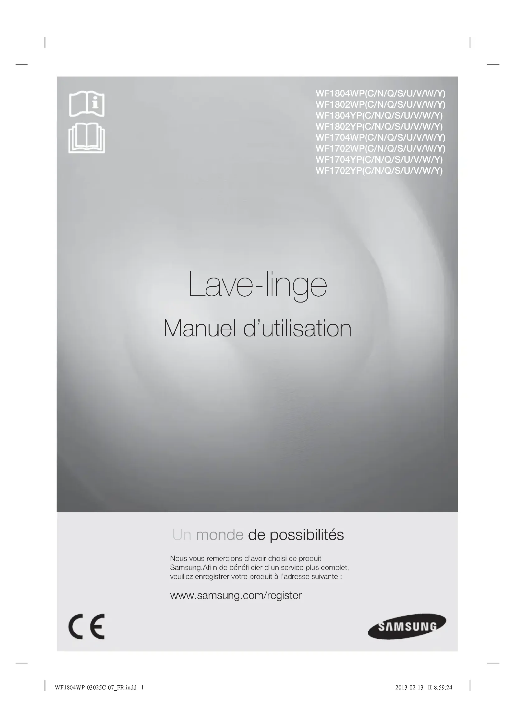 Lave-linge Manuel d’utilisation Un monde de possibilités Nous vous remercions d’avoir choisi ce produit Samsung.Afi n de bénéfi cier d’un service plus complet, veuillez enregistrer votre produit à l’adresse suivante : www.samsung.com/register WF1804WP(C/N/Q/S/U/V/W/Y) WF1802WP(C/N/Q/S/U/V/W/Y) WF1804YP(C/N/Q/S/U/V/W/Y) WF1802YP(C/N/Q/S/U/V/W/Y) WF1704WP(C/N/Q/S/U/V/W/Y) WF1702WP(C/N/Q/S/U/V/W/Y) WF1704YP(C/N/Q/S/U/V/W/Y) WF1702YP(C/N/Q/S/U/V/W/Y) WF1804WP-03025C-07_FR.indd 1WF1804WP-03025C-07_FR.indd 1 2013-02-13 8:59:242013-02-13 8:59:242_ Caractéristiques de votre nouveau lave-linge samsung Caractéristiques de votre nouveau lave-linge samsung Avec ce nouveau lave-linge, faire une lessive prend un tout autre sens. Capacité XXL, économie d’énergie...Le lave-linge Samsung possède toutes les caractéristiques nécessaires pour transformer une tâche désagréable en un vrai moment de plaisir.
