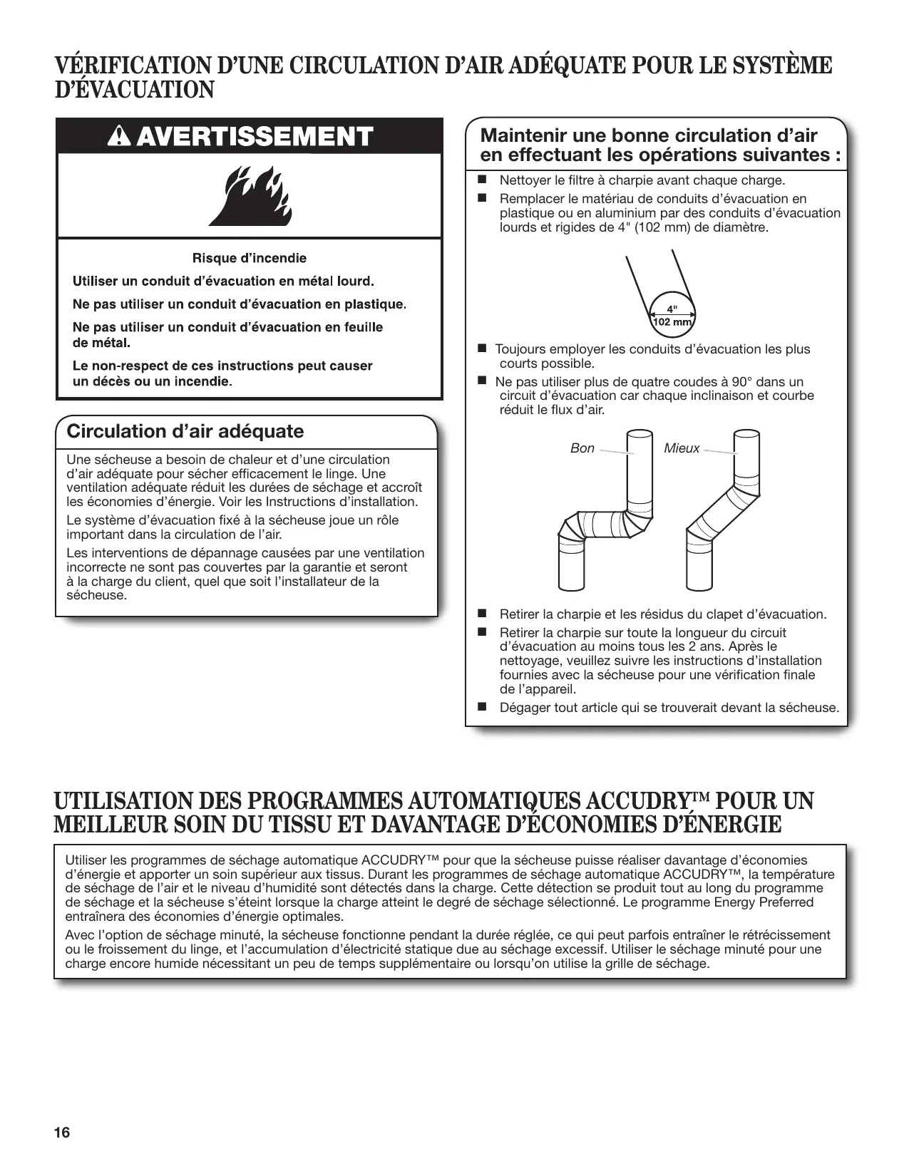 Nettoyer le filtre à charpie avant chaque charge. Remplacer le matériau de conduits d’évacuation en plastique ou en aluminium par des conduits d’évacuation lourds et rigides de 4" (102 mm) de diamètre. n Toujours employer les conduits d’évacuation les plus courts possible. n Ne pas utiliser plus de quatre coudes à 90° dans un circuit d’évacuation car chaque inclinaison et courbe réduit le flux d’air. Circulation d’air adéquate Bon Une sécheuse a besoin de chaleur et d’une circulation d’air adéquate pour sécher efficacement le linge. Une ventilation adéquate réduit les durées de séchage et accroît les économies d’énergie. Voir les Instructions d’installation. Le système d’évacuation fixé à la sécheuse joue un rôle important dans la circulation de l’air. Les interventions de dépannage causées par une ventilation incorrecte ne sont pas couvertes par la garantie et seront à la charge du client, quel que soit l’installateur de la sécheuse. Mieux Retirer la charpie et les résidus du clapet d’évacuation. Retirer la charpie sur toute la longueur du circuit d’évacuation au moins tous les 2 ans. Après le nettoyage, veuillez suivre les instructions d’installation fournies avec la sécheuse pour une vérification finale de l’appareil. n Dégager tout article qui se trouverait devant la sécheuse.