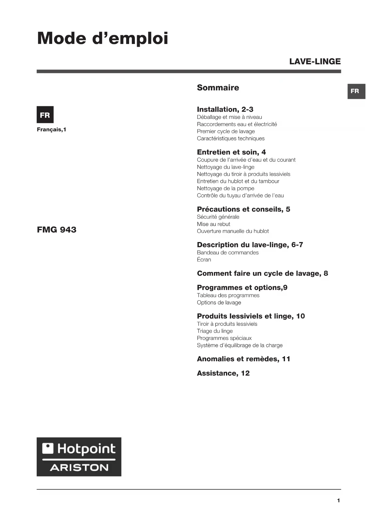 FMG 943B FR.C - Machine à laver HOTPOINT ARISTON - Notice d'utilisation et mode d'emploi gratuit